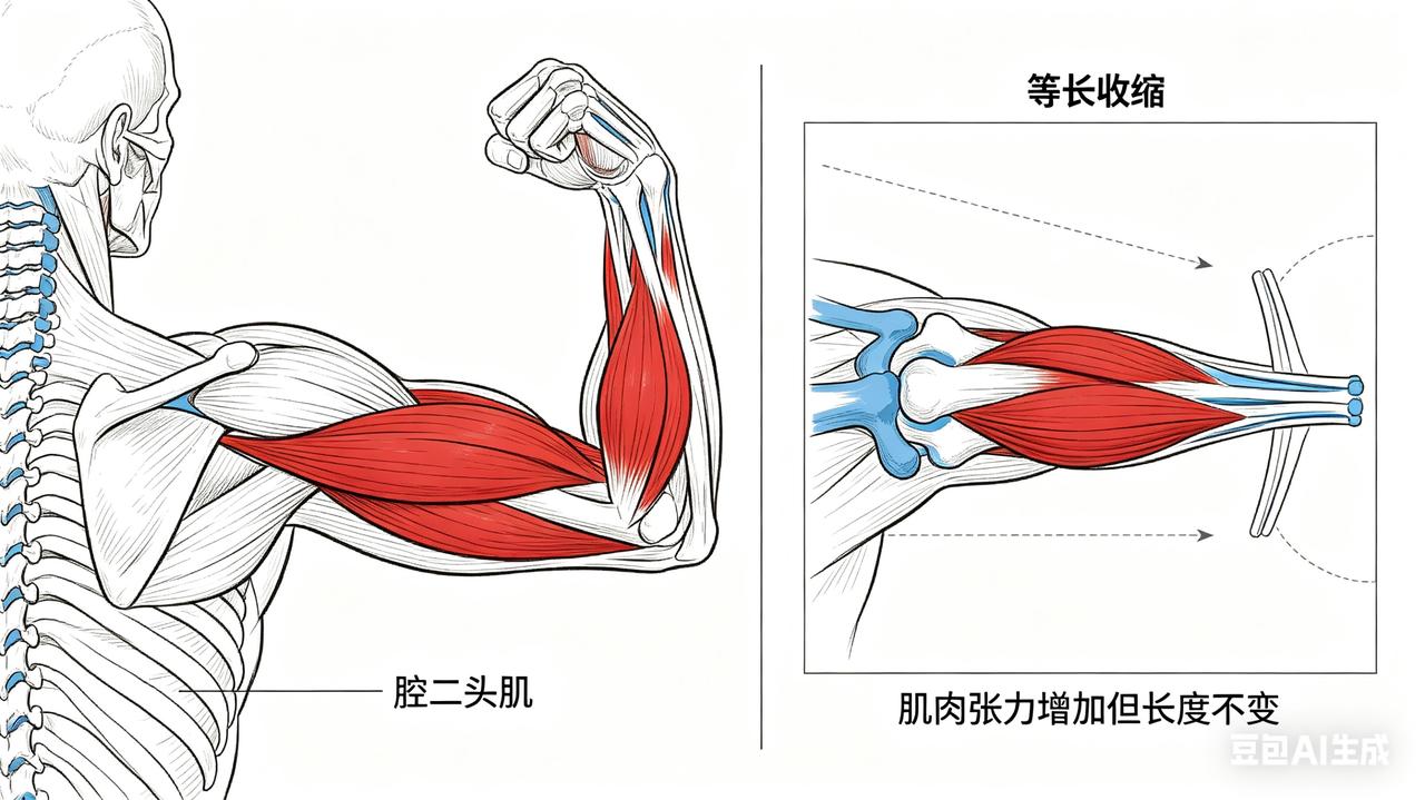 肌肉长度不变,只维持张力、稳定身体姿态。日常坐着、站着保持体态,或是平板支撑时,核心、四肢肌肉都在等长收缩,负责稳定而非发力。