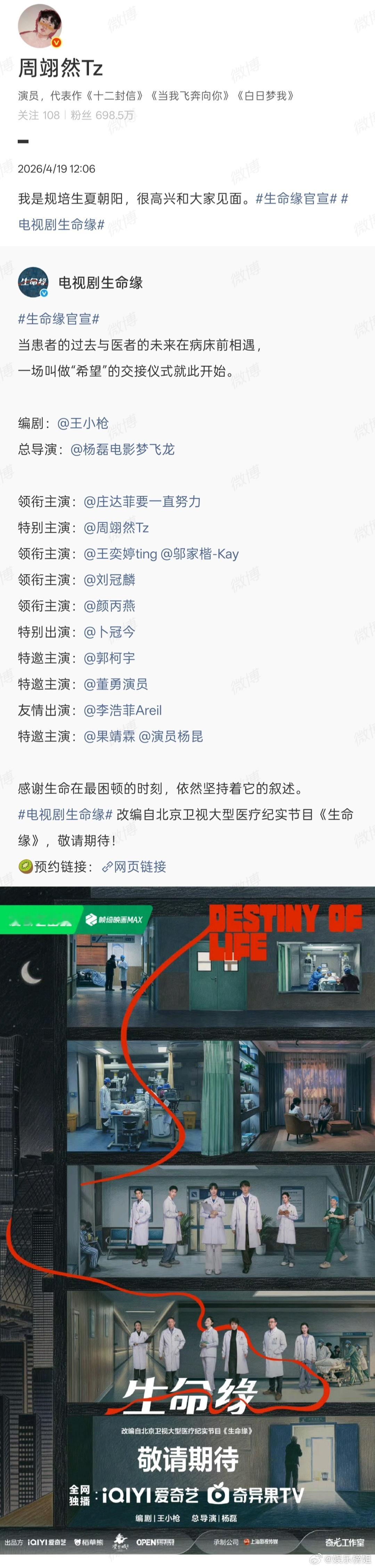 周翊然特别主演生命缘致敬医者,向阳而生, 新身份加载完毕。期待周翊然特别主演的规