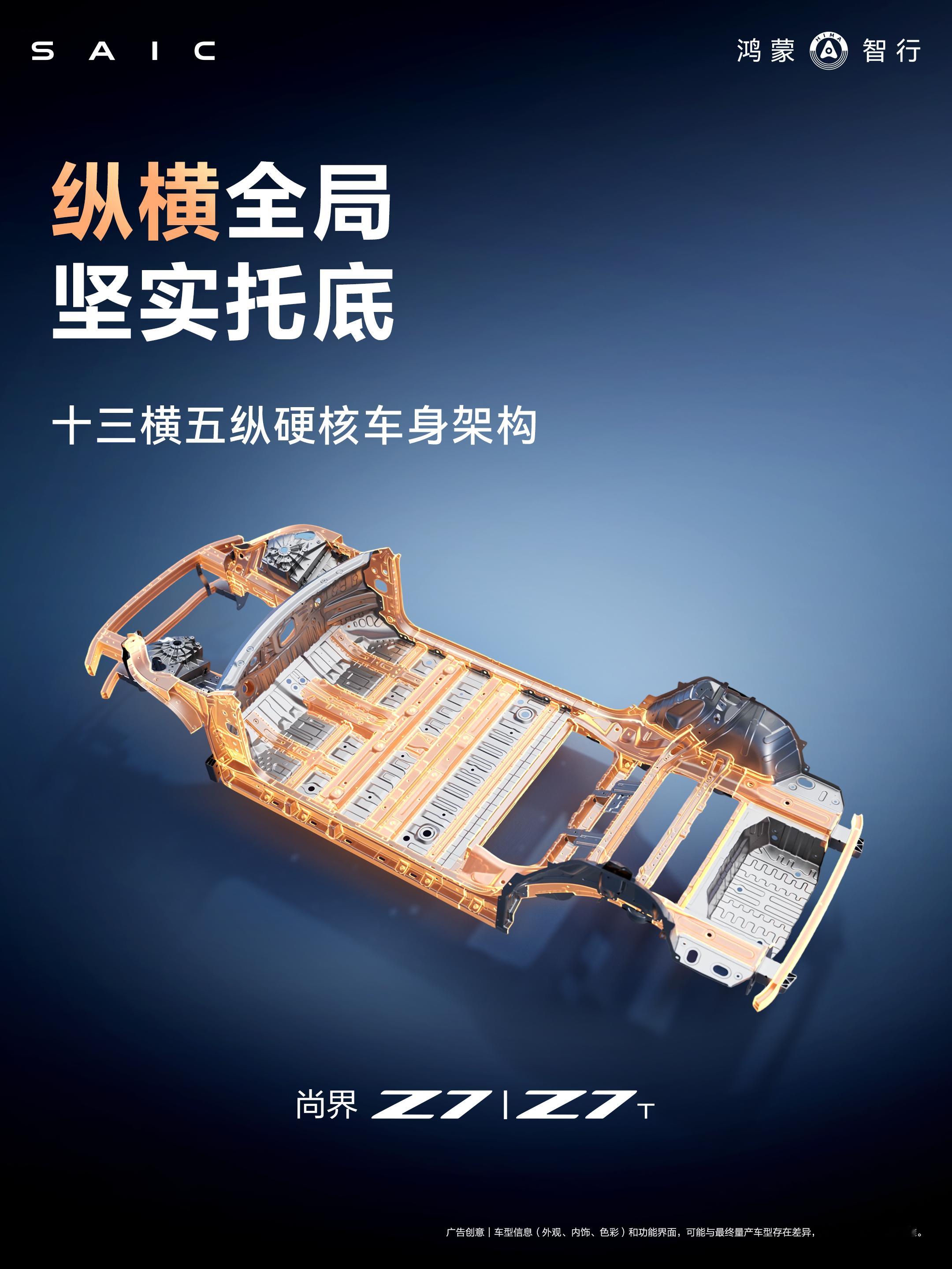尚界 Z7|硬核车身,安全满配安全是最高的信仰。尚界Z7、尚界Z7T笼式硬核车身,全维守护用户出行安全。①全系标配十三横五纵硬核车身架构,高强度钢+铝合金占比达91%,行业领先;②超宽高强度铝合金双前防撞梁,宽度覆盖率75.4%;③超宽高强度铝合金后防撞梁,宽度覆盖率70%;④14处2000MPa热成型钢加强,覆盖整个乘员舱主要防撞区域;⑤5.8倍车重车顶抗压,超强安全防护能力,同级标杆;更多硬核实力,4月22日19:00,鸿蒙智行春季新品发布会,敬请期待!
