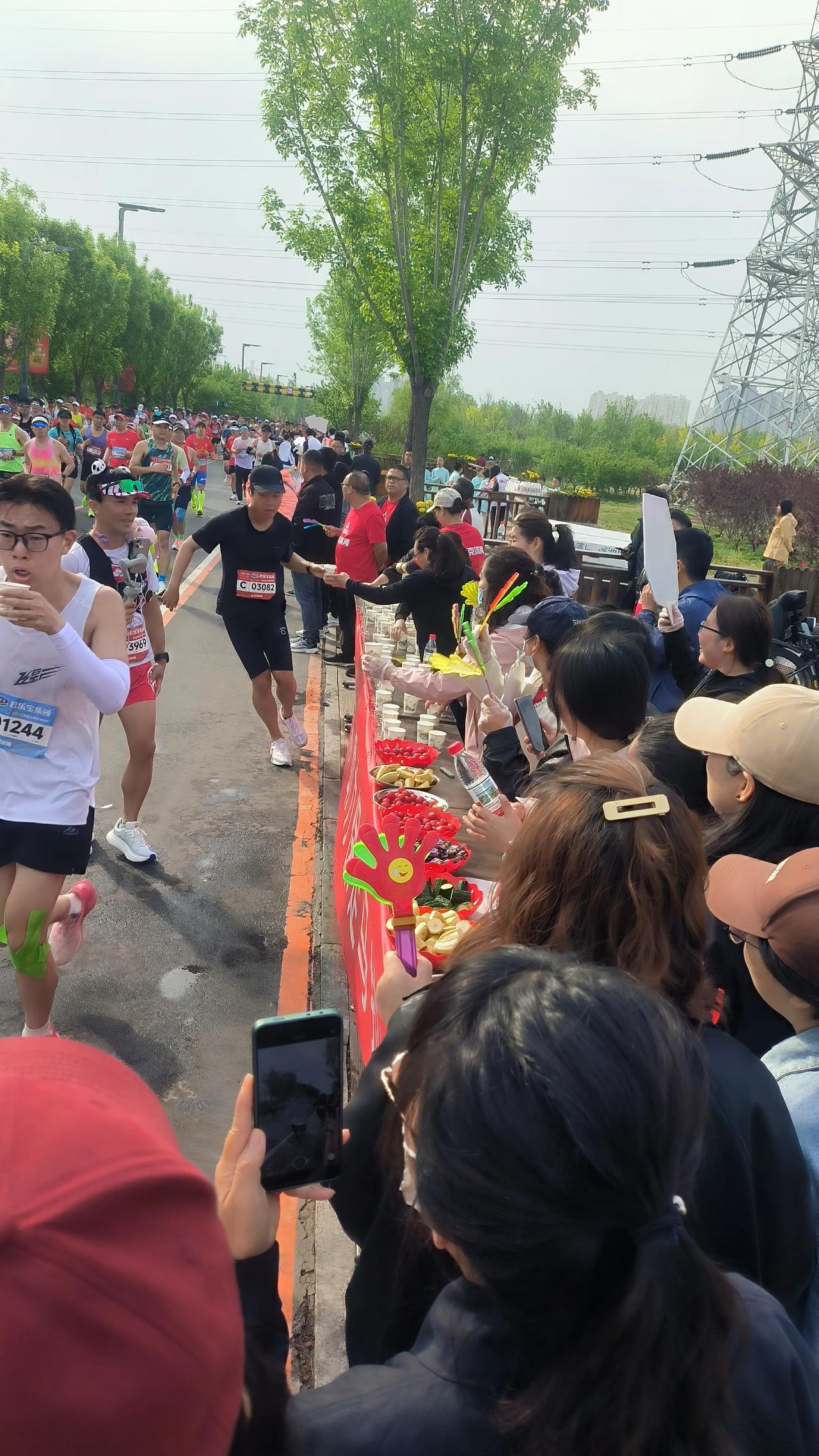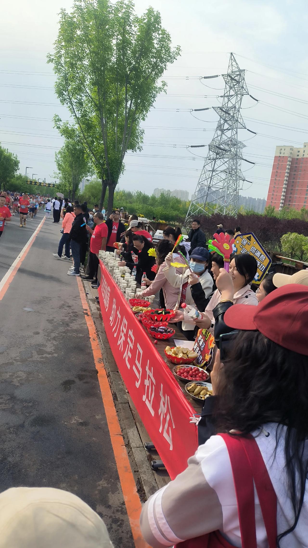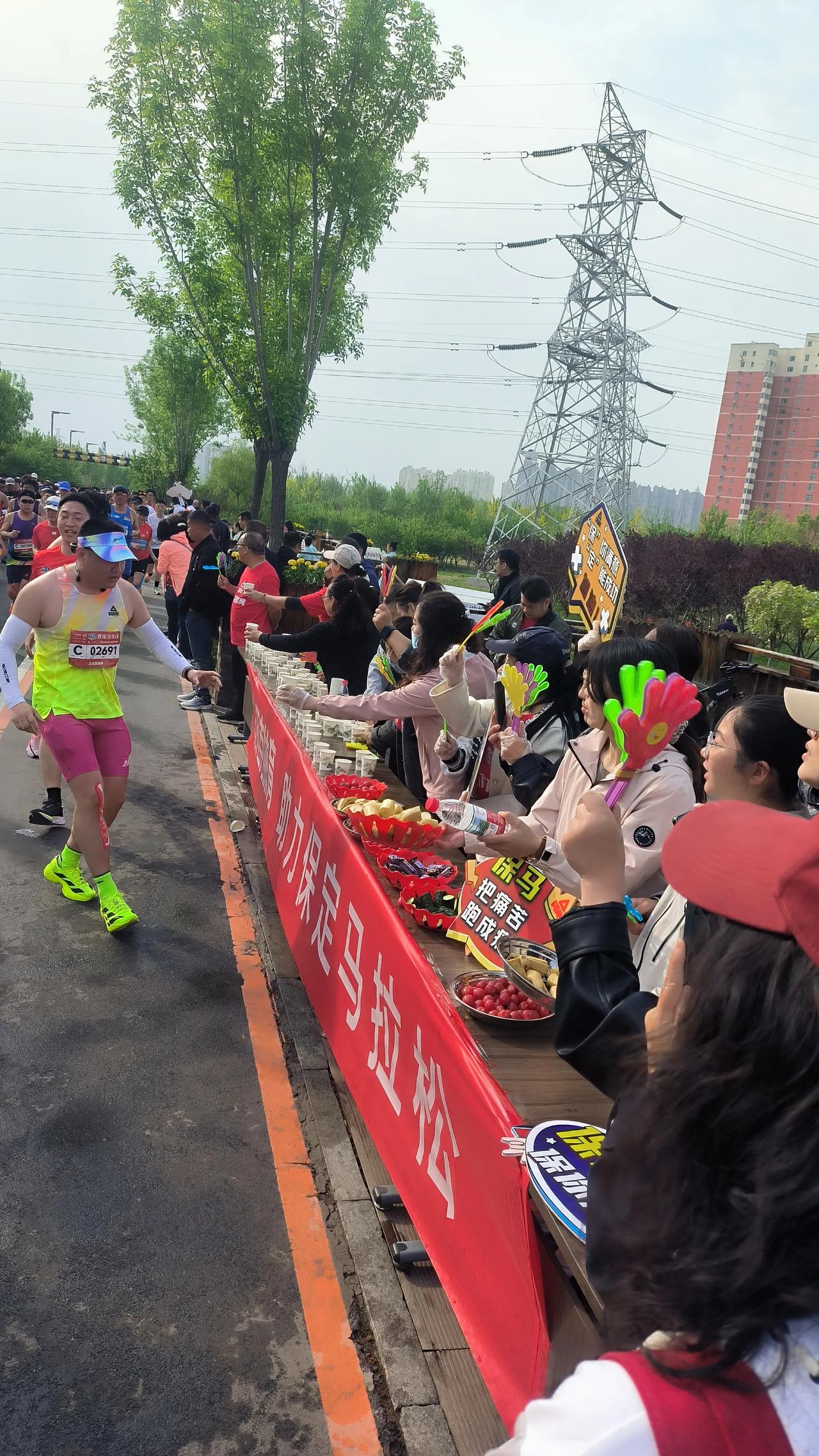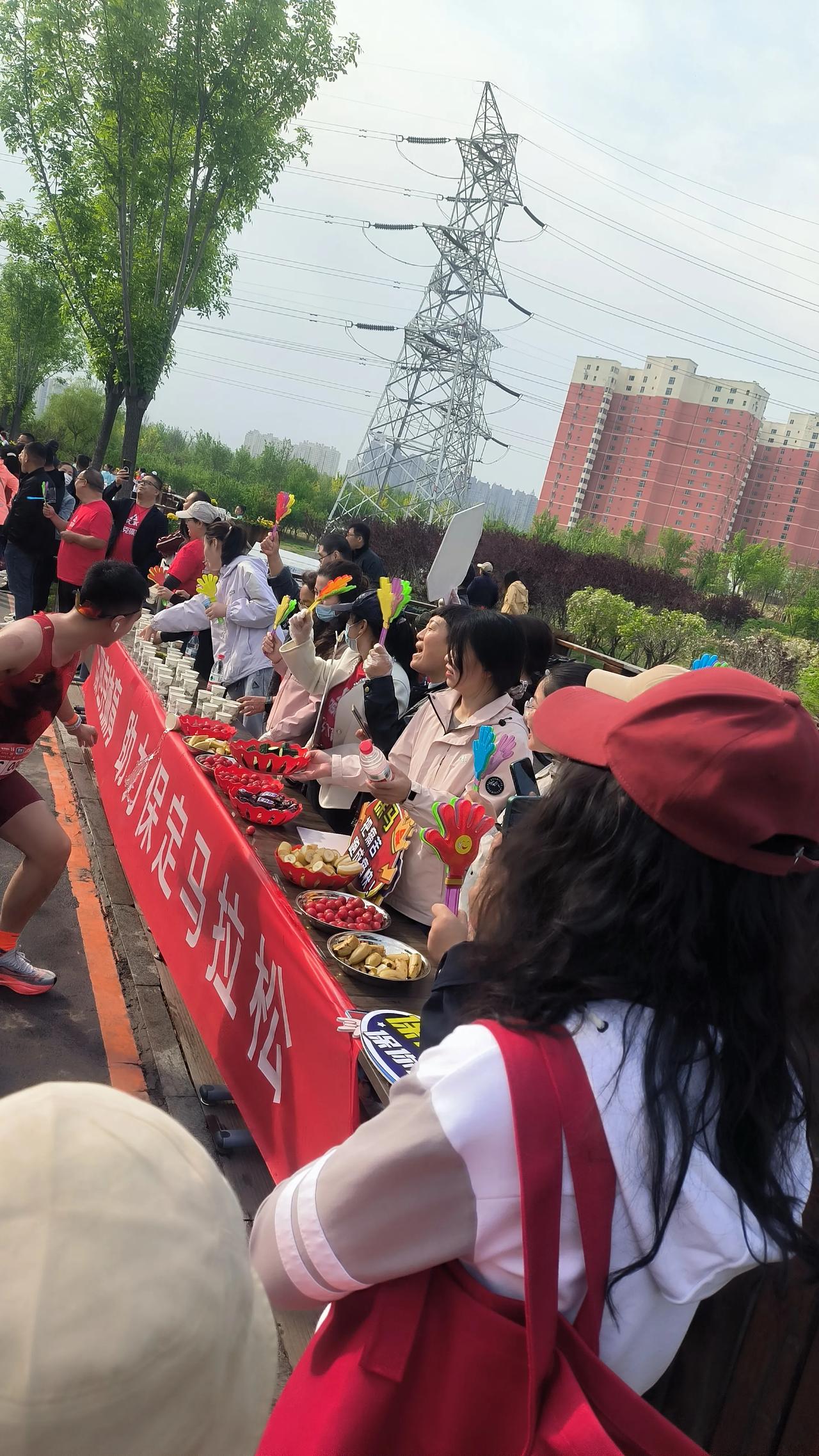 在北堤路地道桥西口的能量补给站,有一群热情的大姐格外醒目。她们不仅响亮地为选手加油,还麻利地递上纯净水、切好的水果。不时有疲惫的跑者前来补充能量,也有人停下脚步,好奇地问:“这里是官方补给站吗?每到有人问,大姐们总是齐声回答(可惜我没听清),但手里的活儿却没停!这份热情,让许多跑者倍感惊喜与温暖。