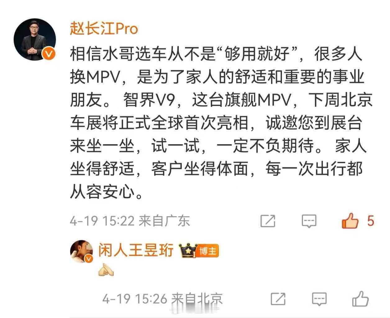 赵长江推荐水哥买智界V9 水哥求MPV,赵长江推荐智界V9。V9配置呼应其核心需求,这场精准互动让新车更受瞩目,静待北京车展亮相。