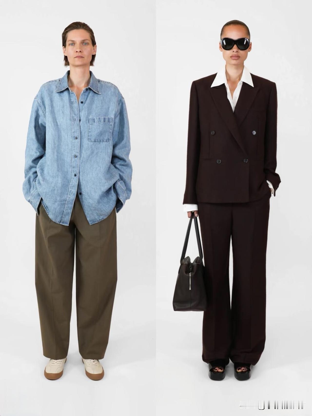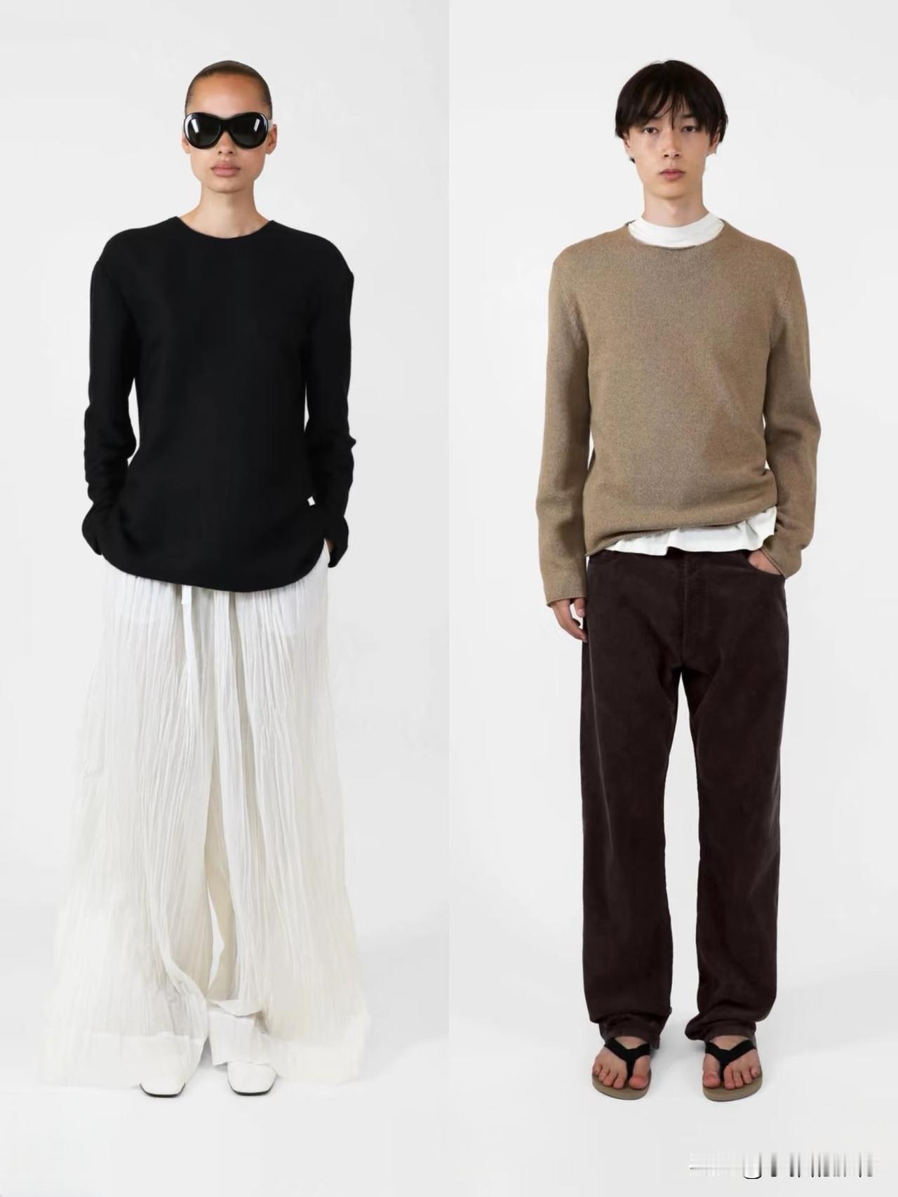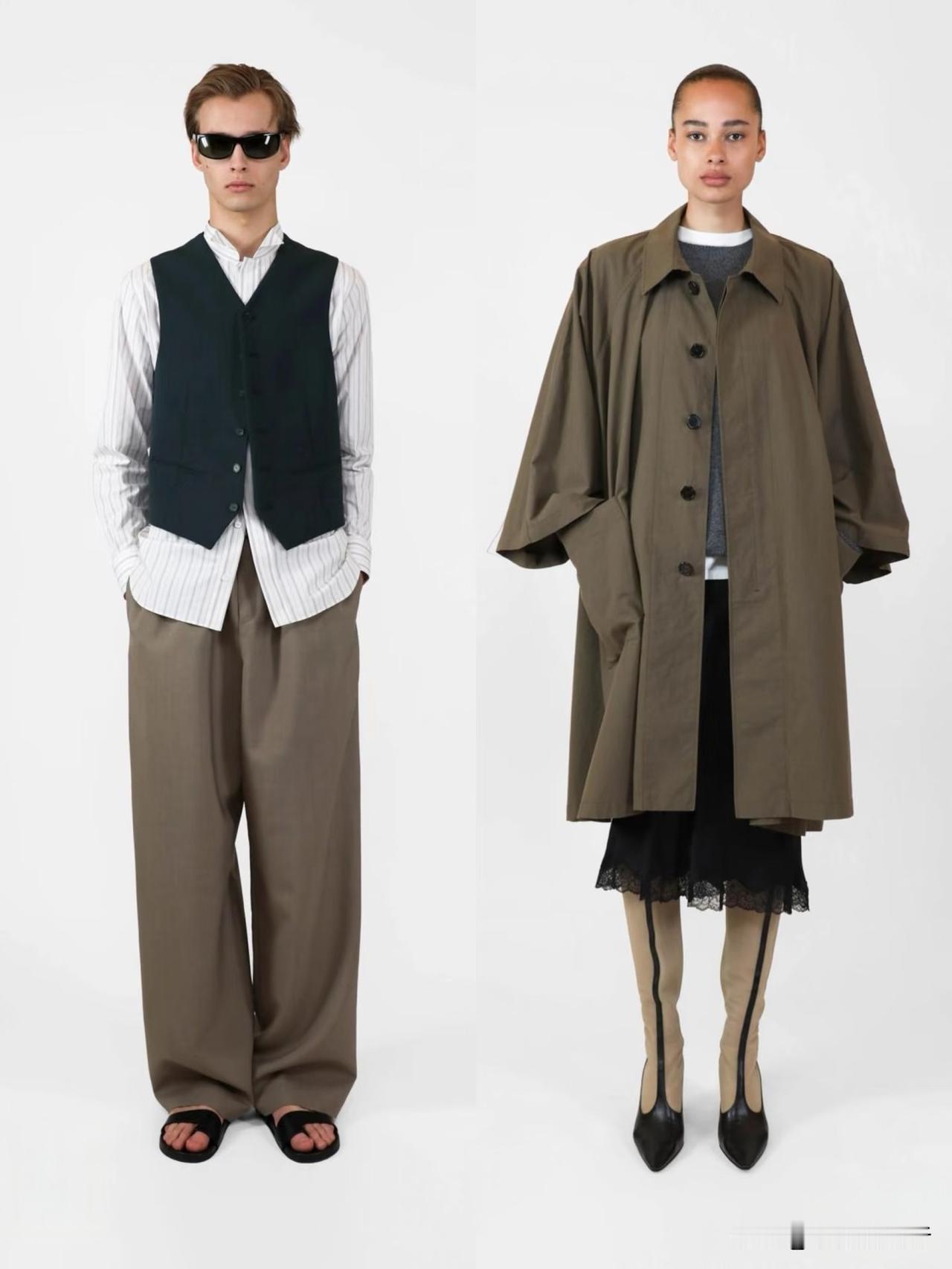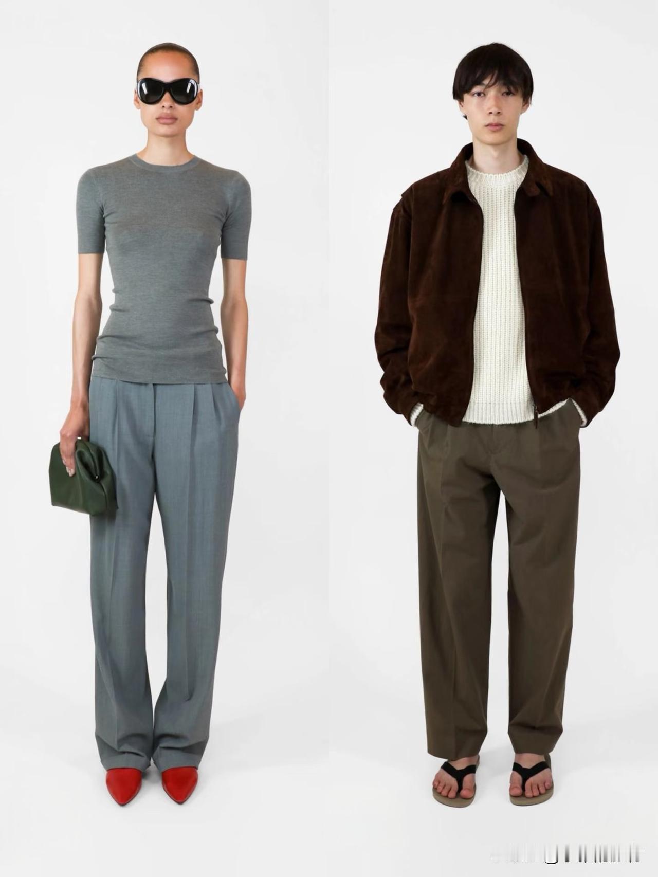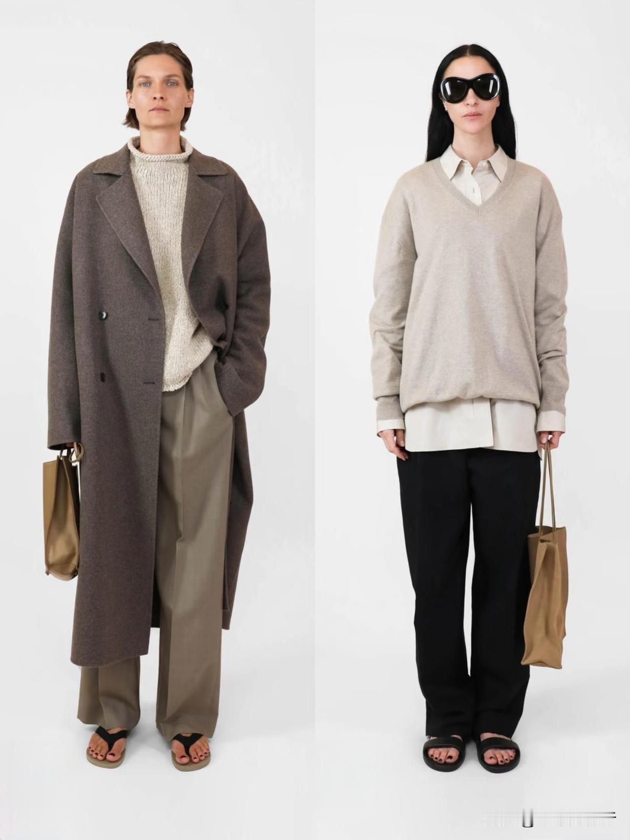 材质上偏爱羊毛、棉麻、真丝等天然面料,软硬碰撞间自带温润质感。廓形遵循宽松与合身的平衡,落肩西装、宽松针织搭配直筒裤、垂感长裙,上宽下直的线条利落不拖沓。