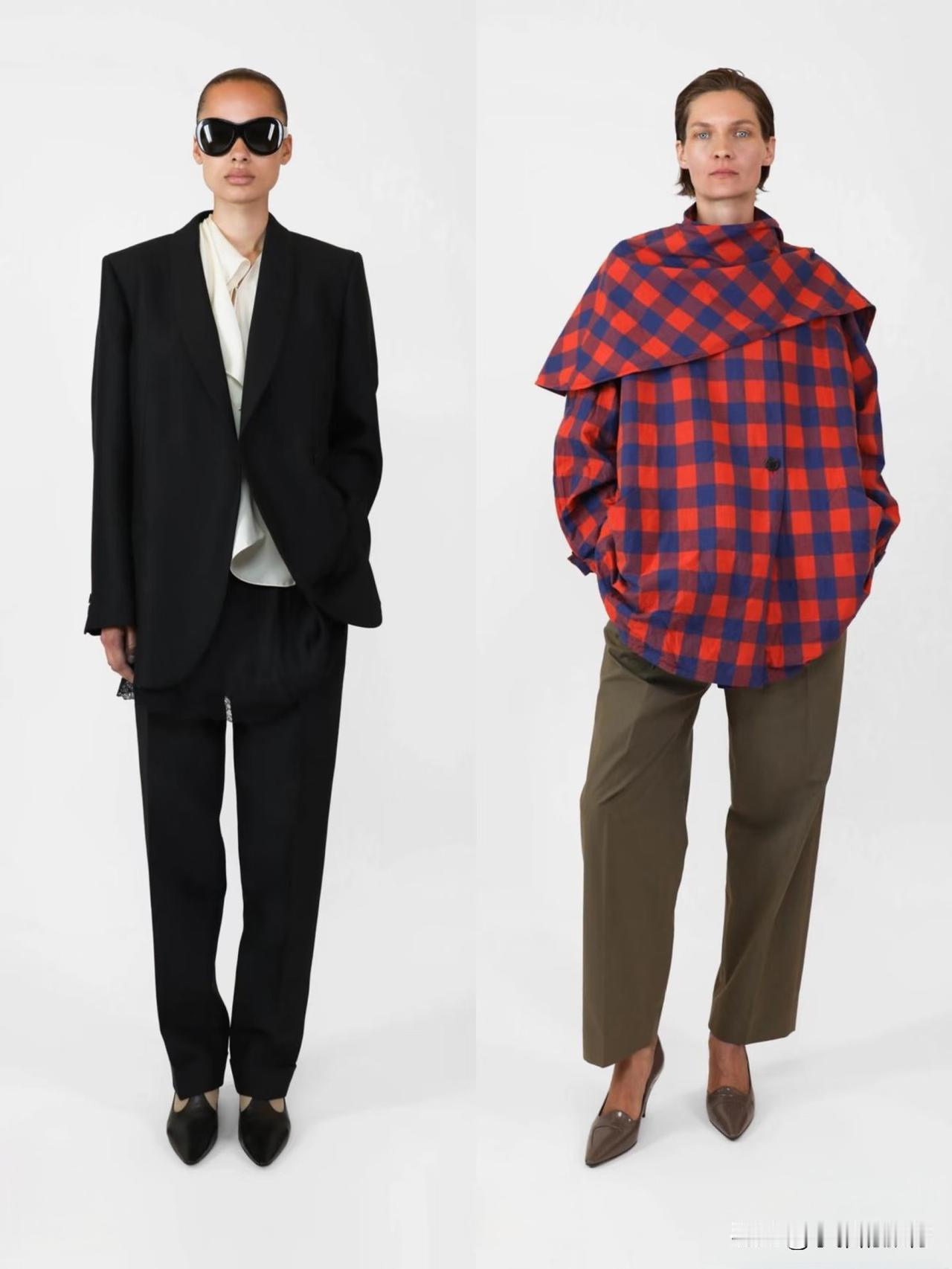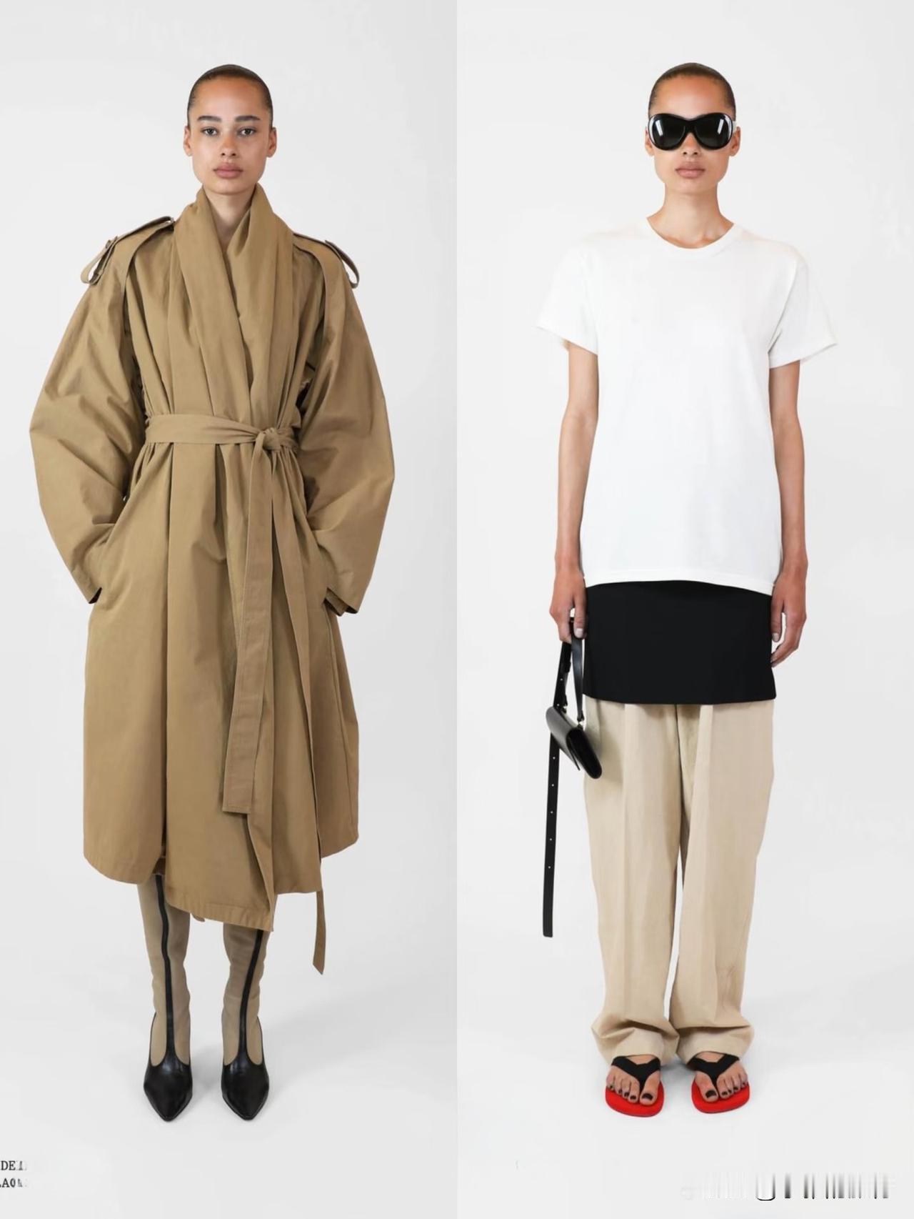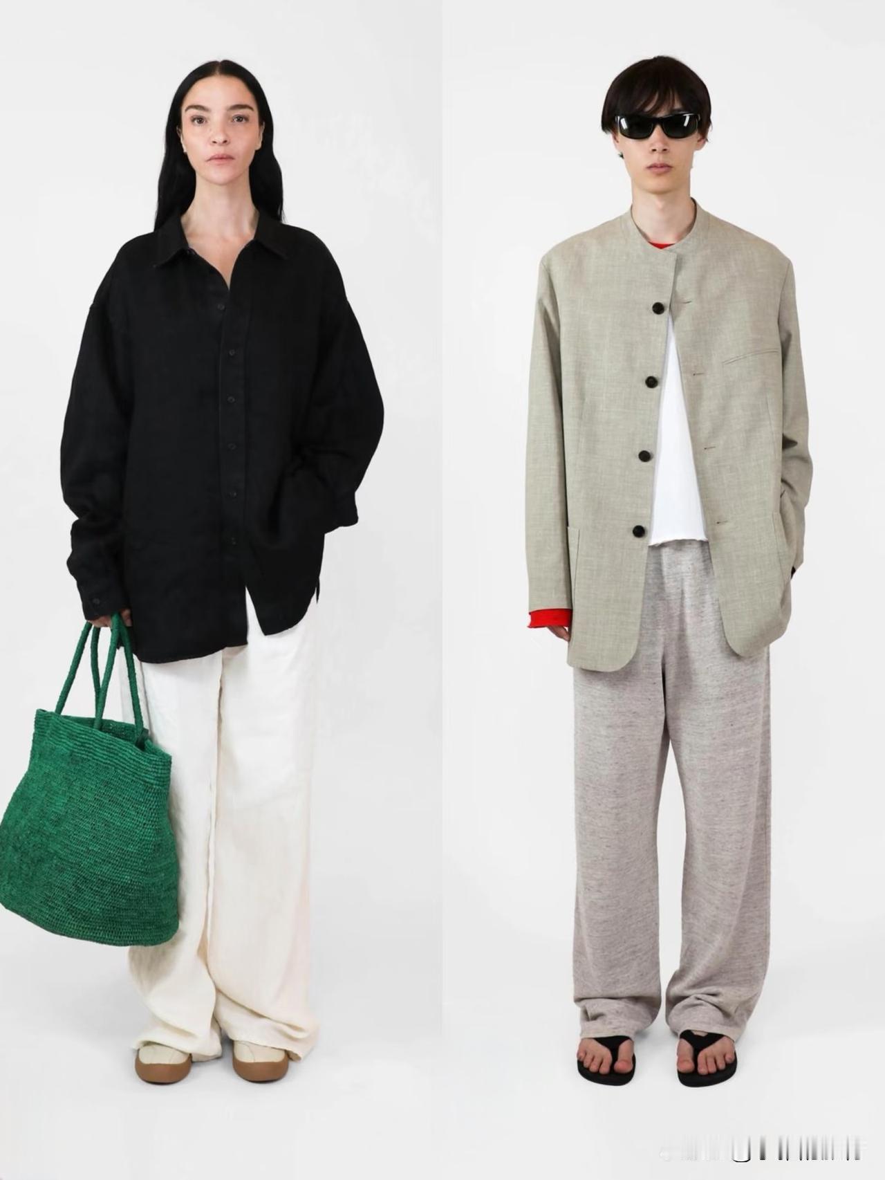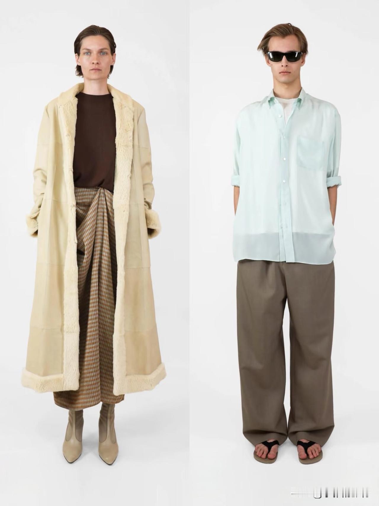 材质上偏爱羊毛、棉麻、真丝等天然面料,软硬碰撞间自带温润质感。廓形遵循宽松与合身的平衡,落肩西装、宽松针织搭配直筒裤、垂感长裙,上宽下直的线条利落不拖沓。
