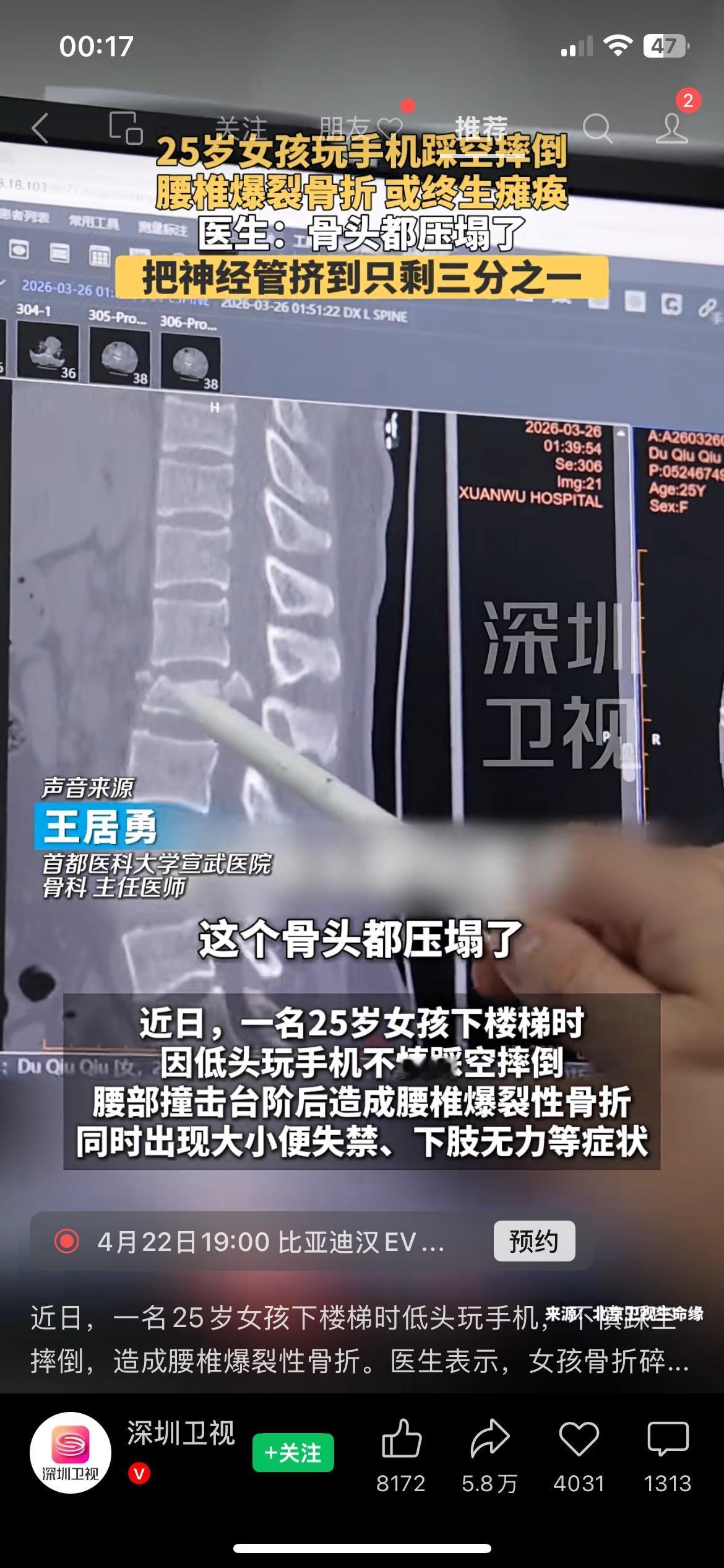 刷到一个特别让人后怕的新闻,一个25岁姑娘下楼梯时低头看手机,一脚踩空直接摔成腰椎骨折。