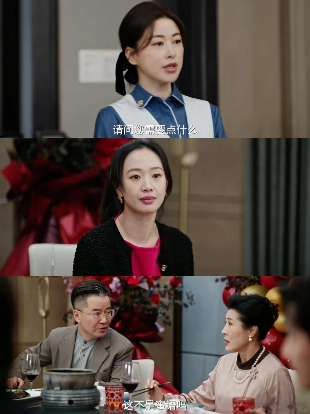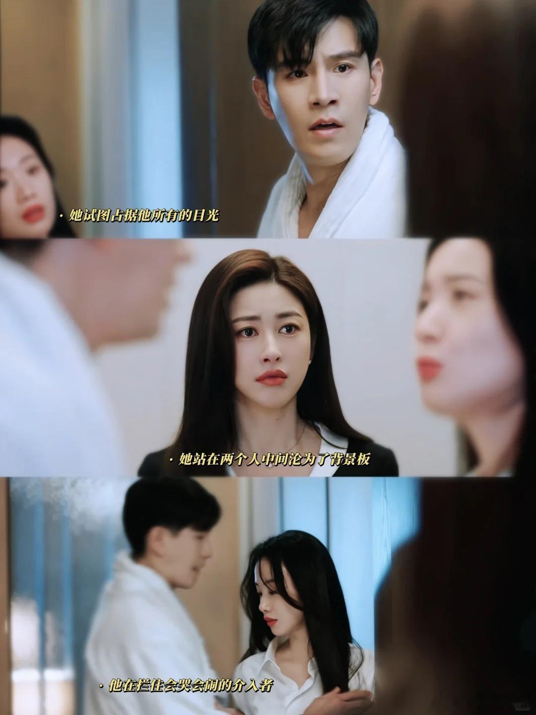 小三上位怀孕丈夫盯着前任 原配从容淡定气场碾压,妆容精致姿态大方,对比身旁局促不