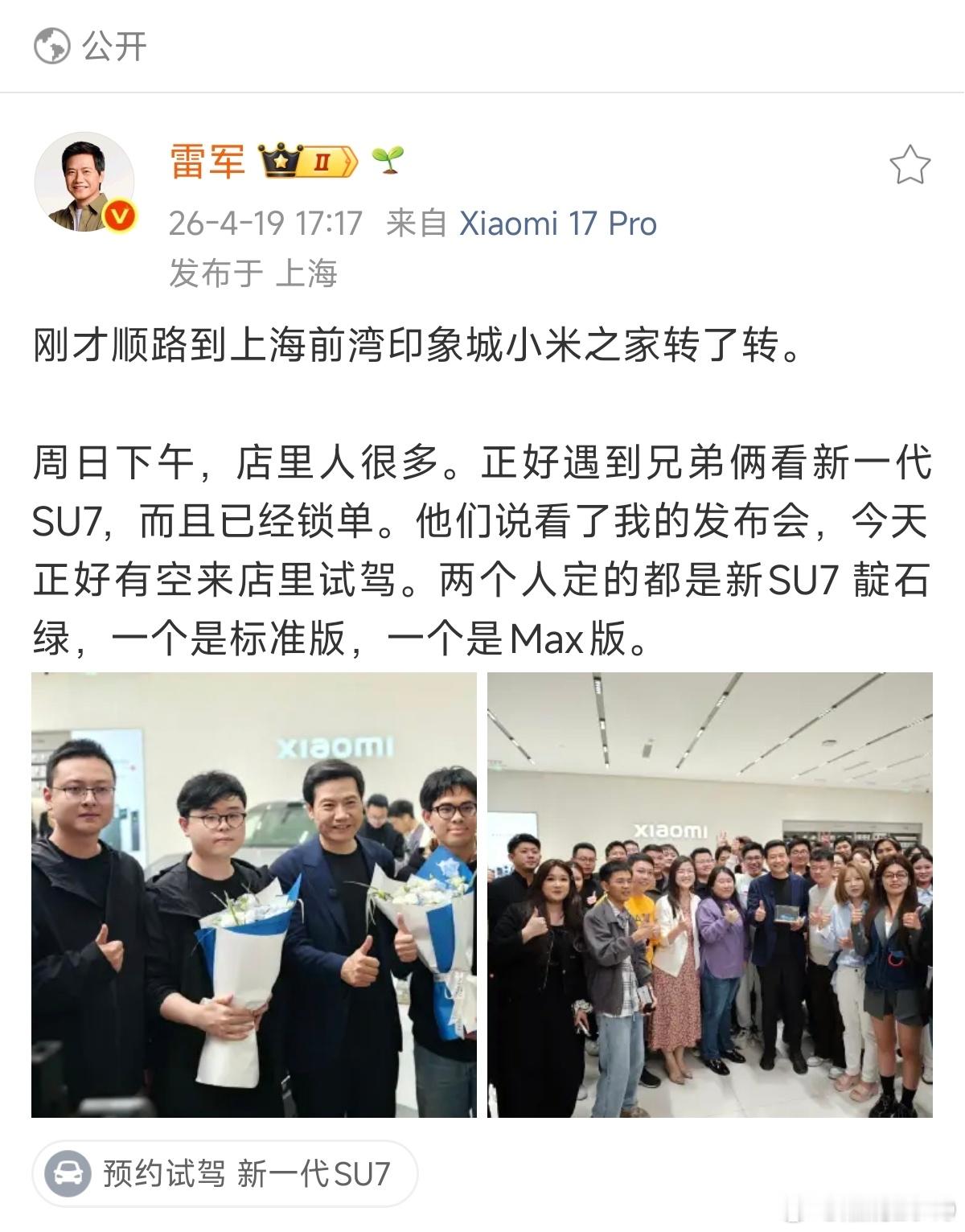 雷总真的太特种兵了!!还是顶夯那一类的4.17连续直播了15个小时之后,第二天早上依然雷打不动六点多发了条微博…然后今天白天刚参加完China GT,又连轴闪现上海前湾印象城小米之家