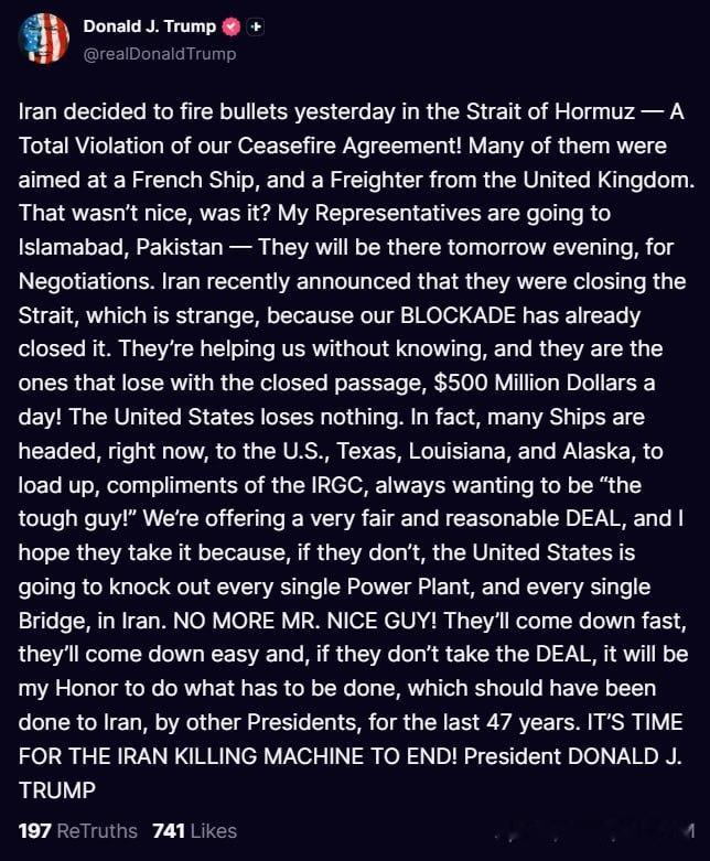 特朗普总统通过 Truth Social 发声:伊朗昨天在霍尔木兹海峡开火——这完全违反了我们的停火协议!其中许多炮弹是针对一艘法国船只和一艘英国货轮的。这可不太友好,对吧?