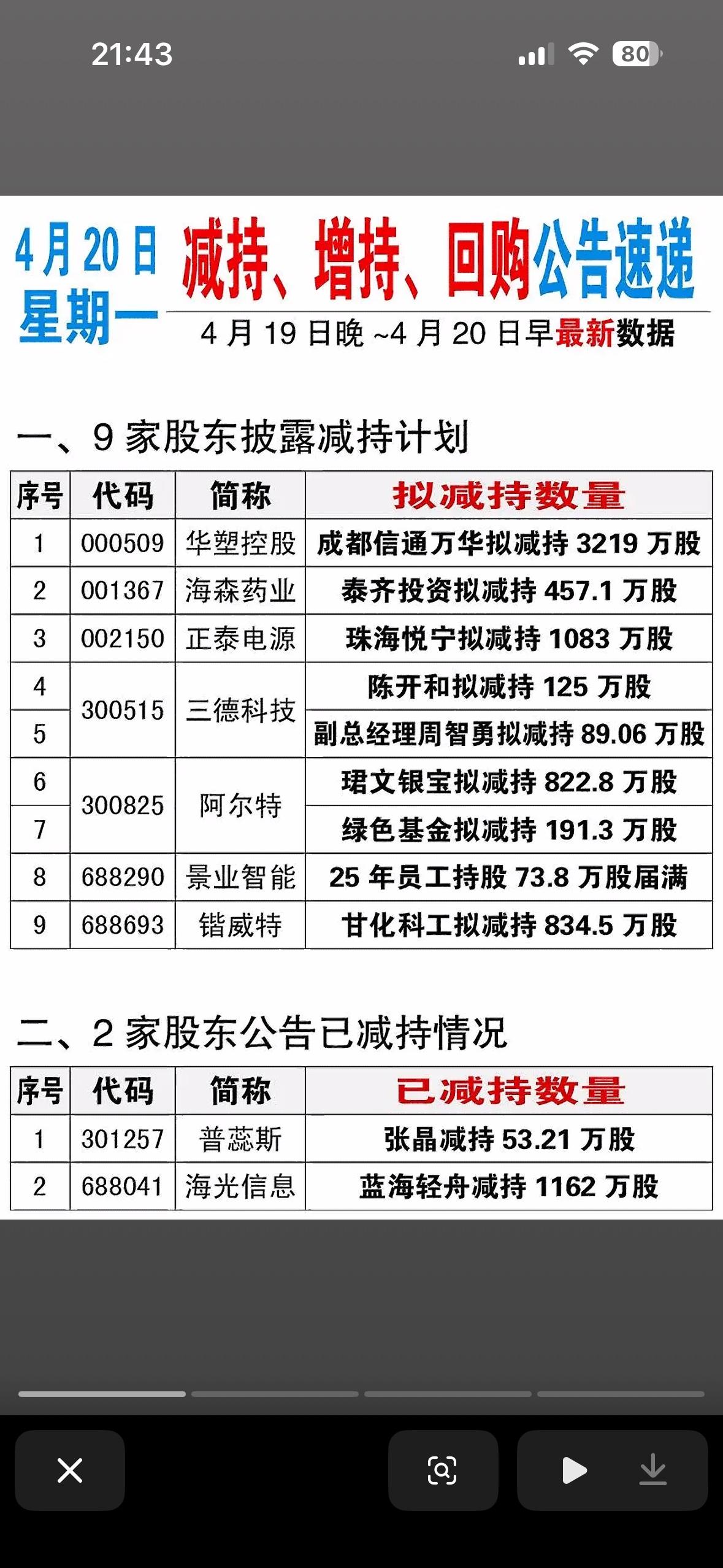 4月20日减持公告速递 📢 9家股东计划减持,2家已减持完成! 4月20日