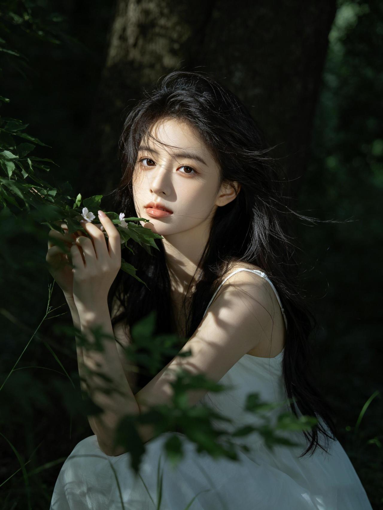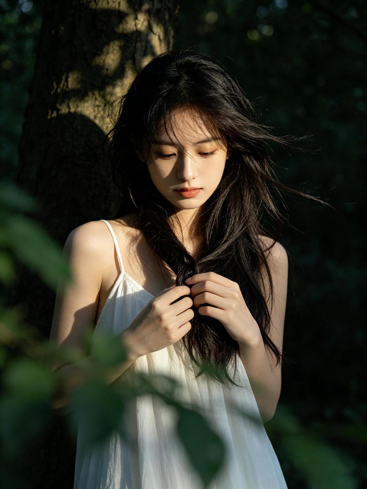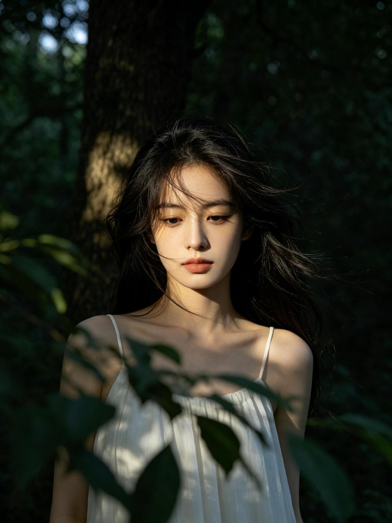 来看一下这组暗调人像作品,从前期构思到后期落地,形成了一个严密的逻辑闭环。画面的整体基调是压抑中的温柔,深绿色的背景不仅提供了自然的纹理,更奠定了神秘、幽静的基调,为少女的气质提供了完美的舞台。