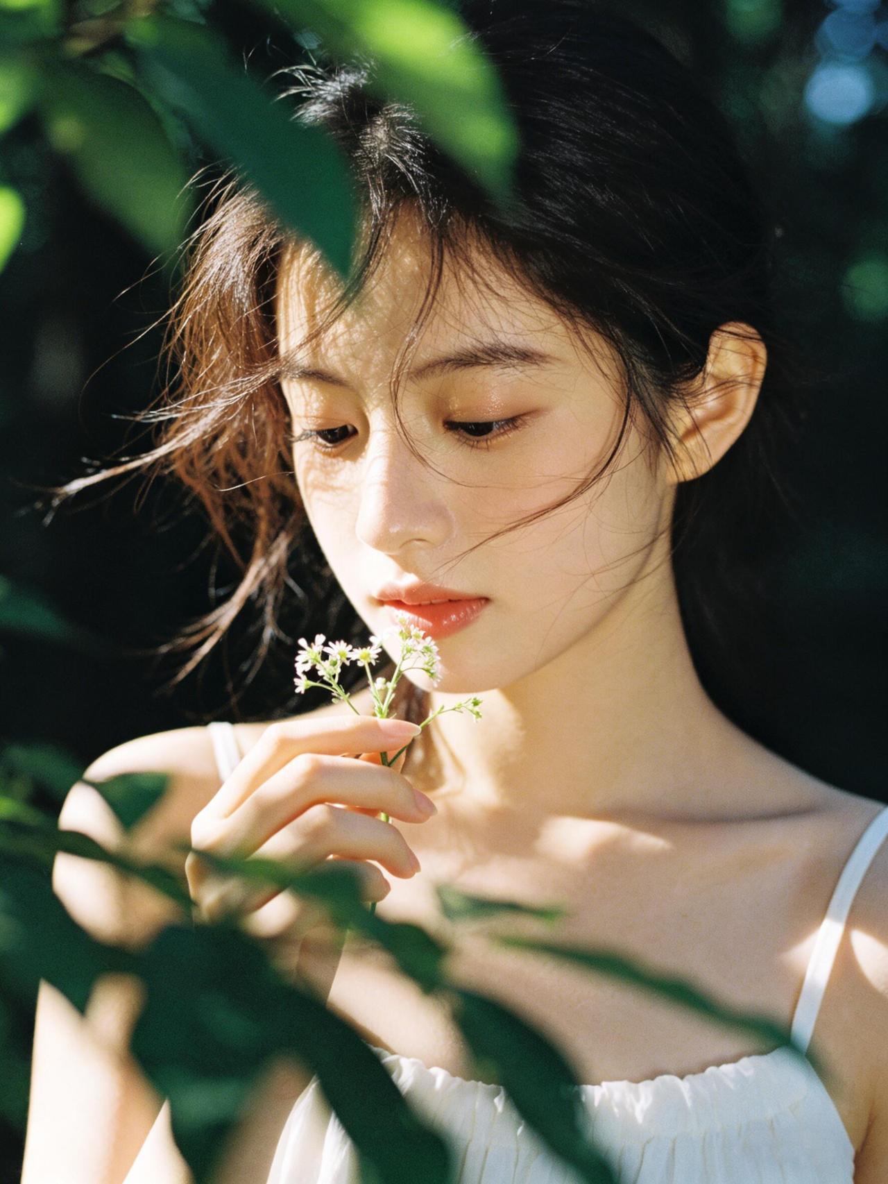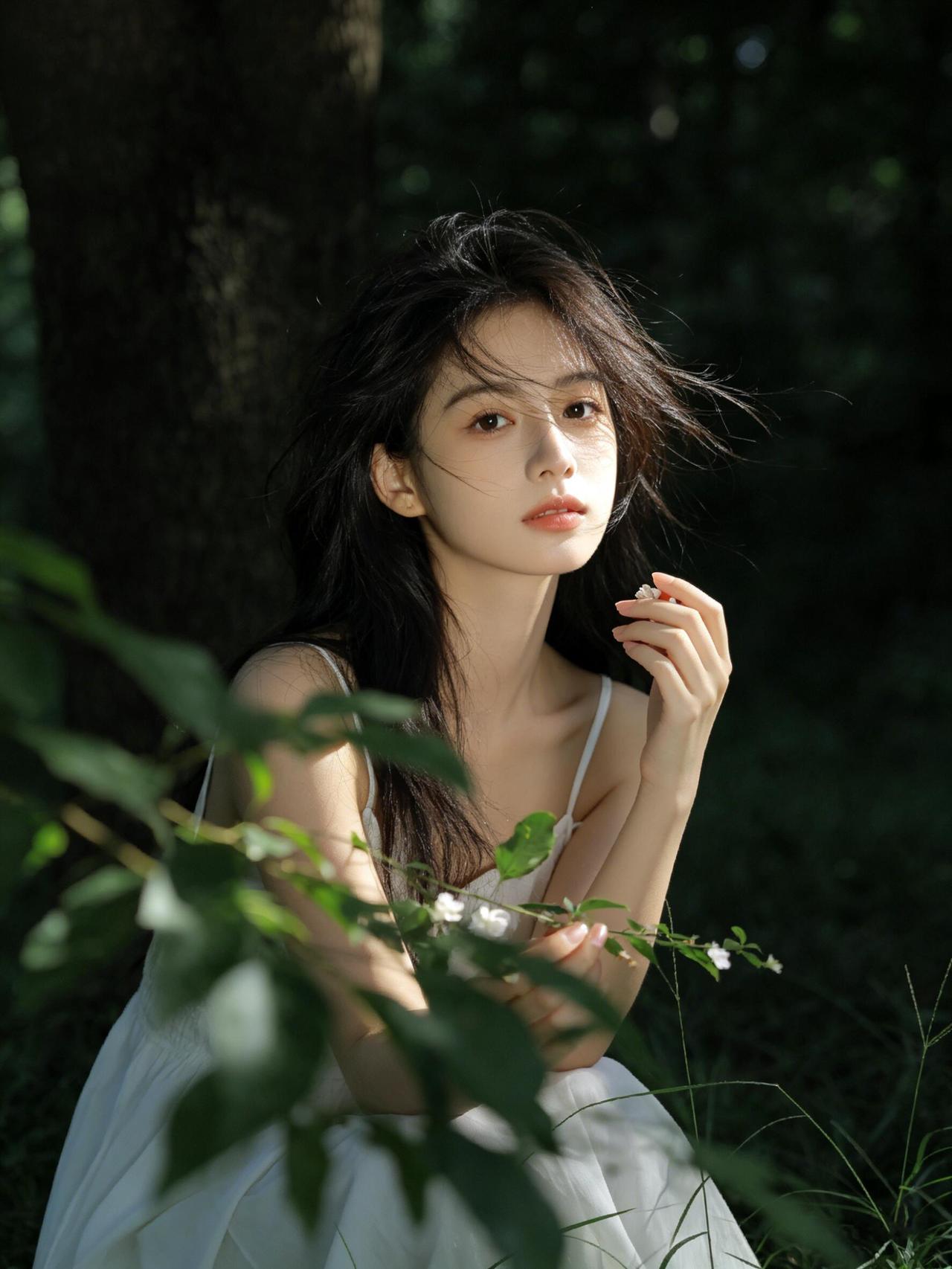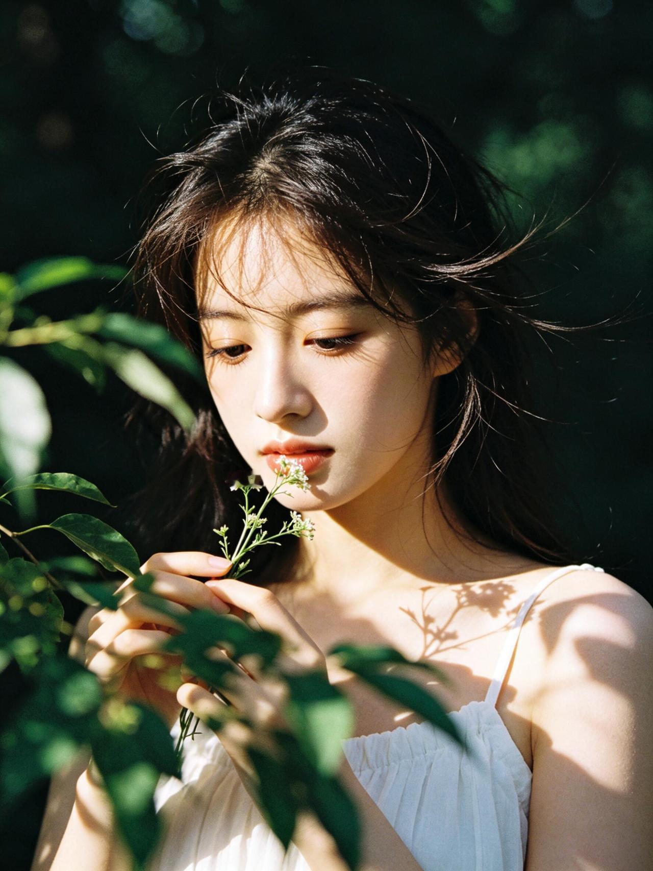 来看一下这组暗调人像作品,从前期构思到后期落地,形成了一个严密的逻辑闭环。画面的整体基调是压抑中的温柔,深绿色的背景不仅提供了自然的纹理,更奠定了神秘、幽静的基调,为少女的气质提供了完美的舞台。