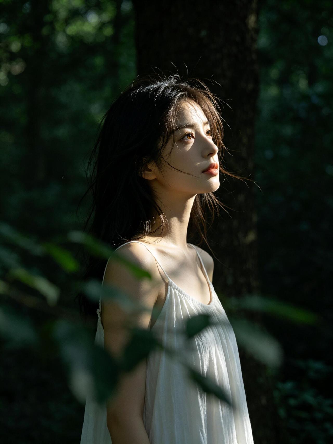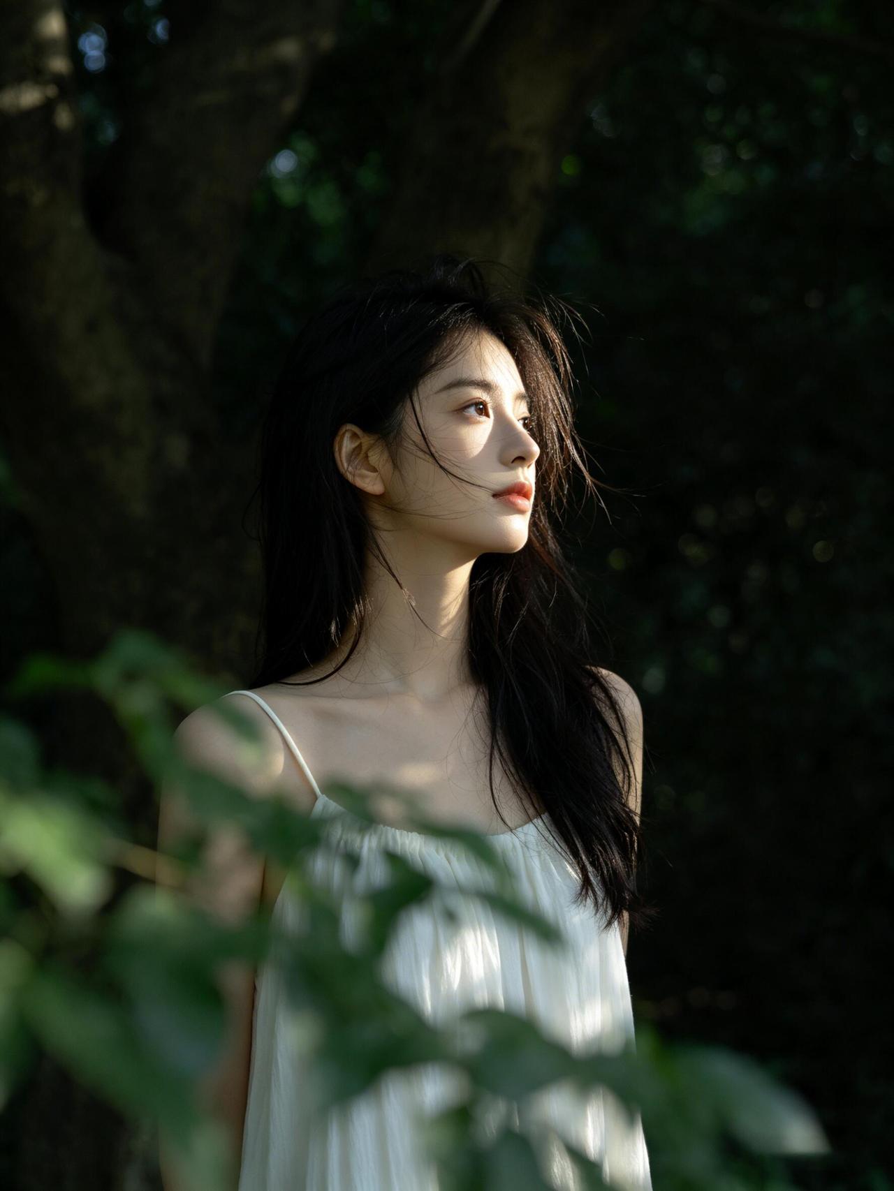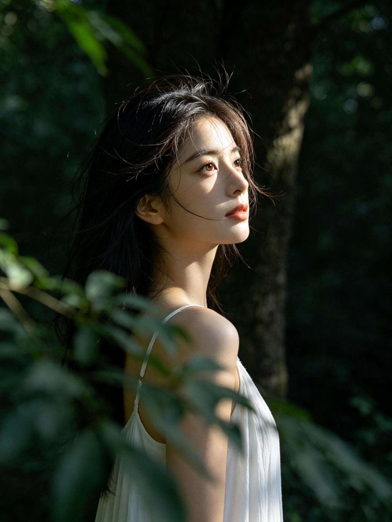 光线的处理是这组照片的点睛之笔,并非平铺直叙的补光,而是极具目的性的雕刻工具。侧逆光的角度精准地勾勒出面部轮廓与发丝纹理,在暗背景的衬托下,这束光成为了视觉中心,营造出强烈的戏剧张力。皮肤质感的表现尤为出色,通透且细腻,同时保留了真实的纹理细节,避免了过度磨皮带来的塑料感。