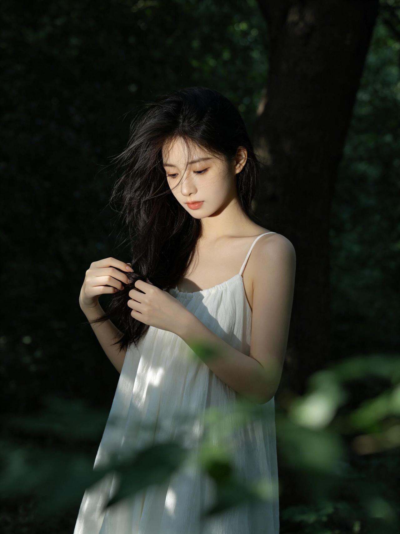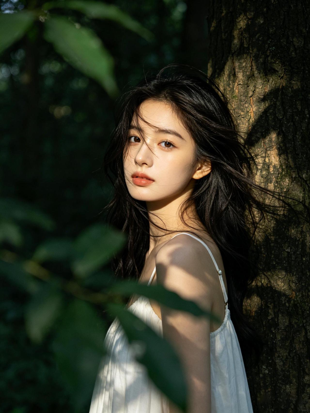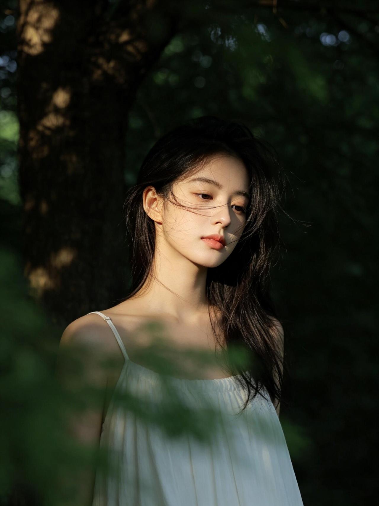 光线的处理是这组照片的点睛之笔,并非平铺直叙的补光,而是极具目的性的雕刻工具。侧逆光的角度精准地勾勒出面部轮廓与发丝纹理,在暗背景的衬托下,这束光成为了视觉中心,营造出强烈的戏剧张力。皮肤质感的表现尤为出色,通透且细腻,同时保留了真实的纹理细节,避免了过度磨皮带来的塑料感。