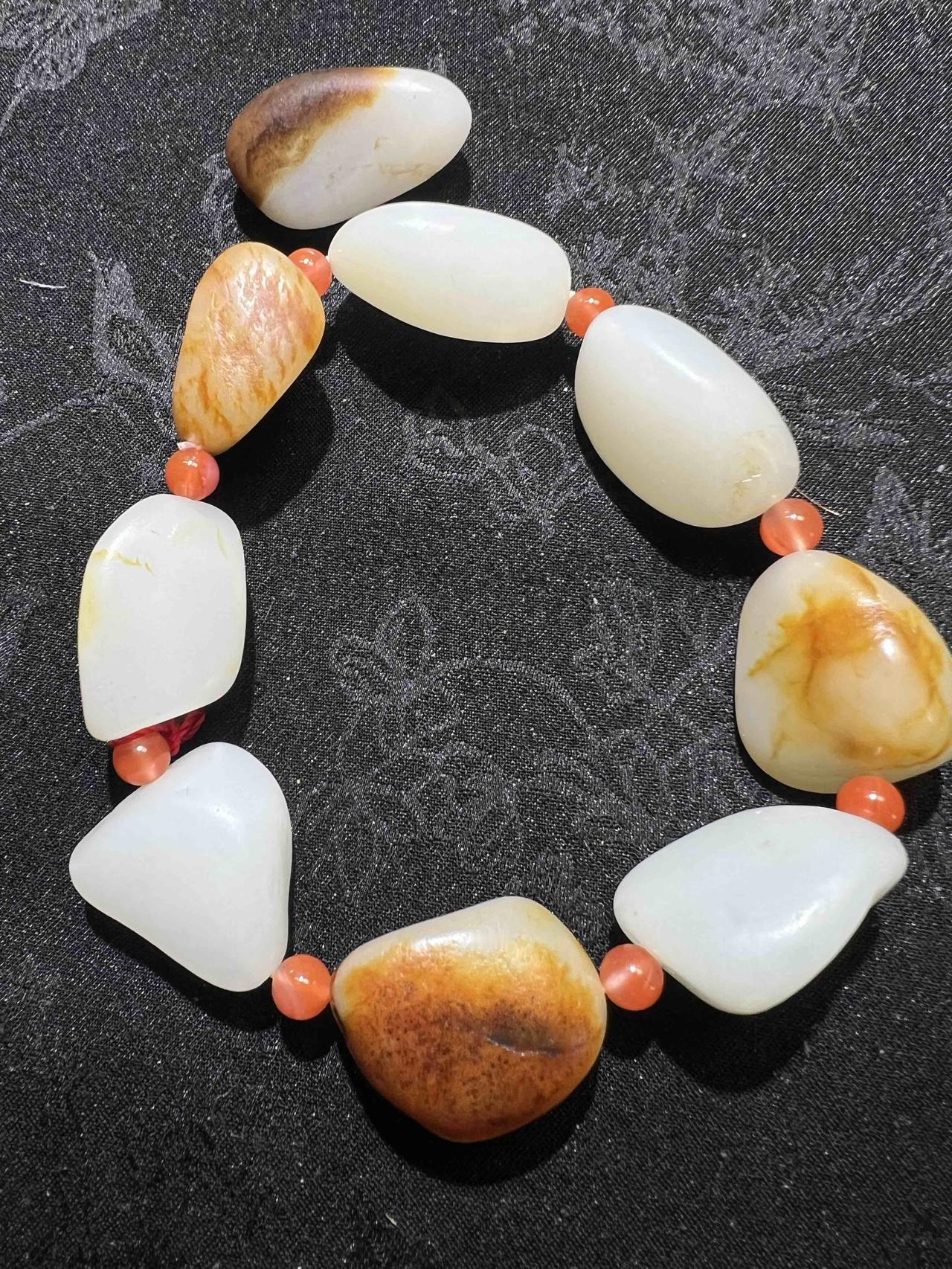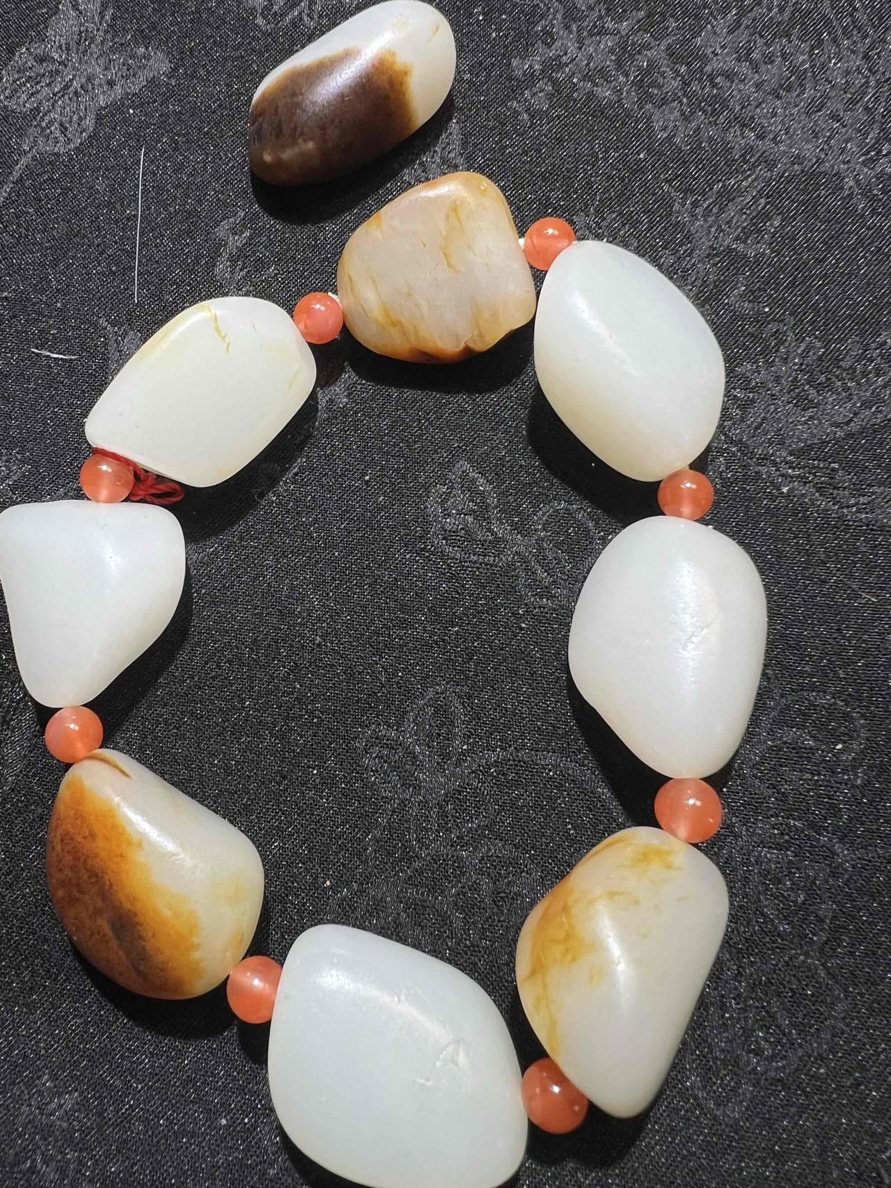 第二种是类似山流水的沁料。市场上很多红沁籽料,其实就是用河北唐河沁料冒充新疆料售卖的。河北唐河沁料相对干净,表皮还有皮。它的主要销售市场是苏州,买家包括玉雕大师和一些知名工作室。