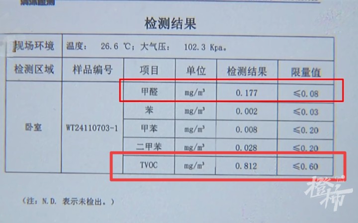 杭州清沐检测科技有限公司为朱女士租房出具的“室内空气”检测报告显示,卧室甲醛为0.177(㎎/m³),是标准限值(≤0.08)的2.21倍,TVOC(㎎/m³)为0.812同样超标(标准限值≤0.60)。当时房东曾问“密封了多长时间?”租客发信息给房东,“先进行数小时的通风,通风到晚上19:30开始封闭,第二天上午9:30进行检测,密封约14小时,这个操作是由检测技术员事前指导的,且全程房间内无个人物品,封闭时、检测时均有录像。(以上表述同样出现在杭州市滨江区人民法院民事判决书上)”