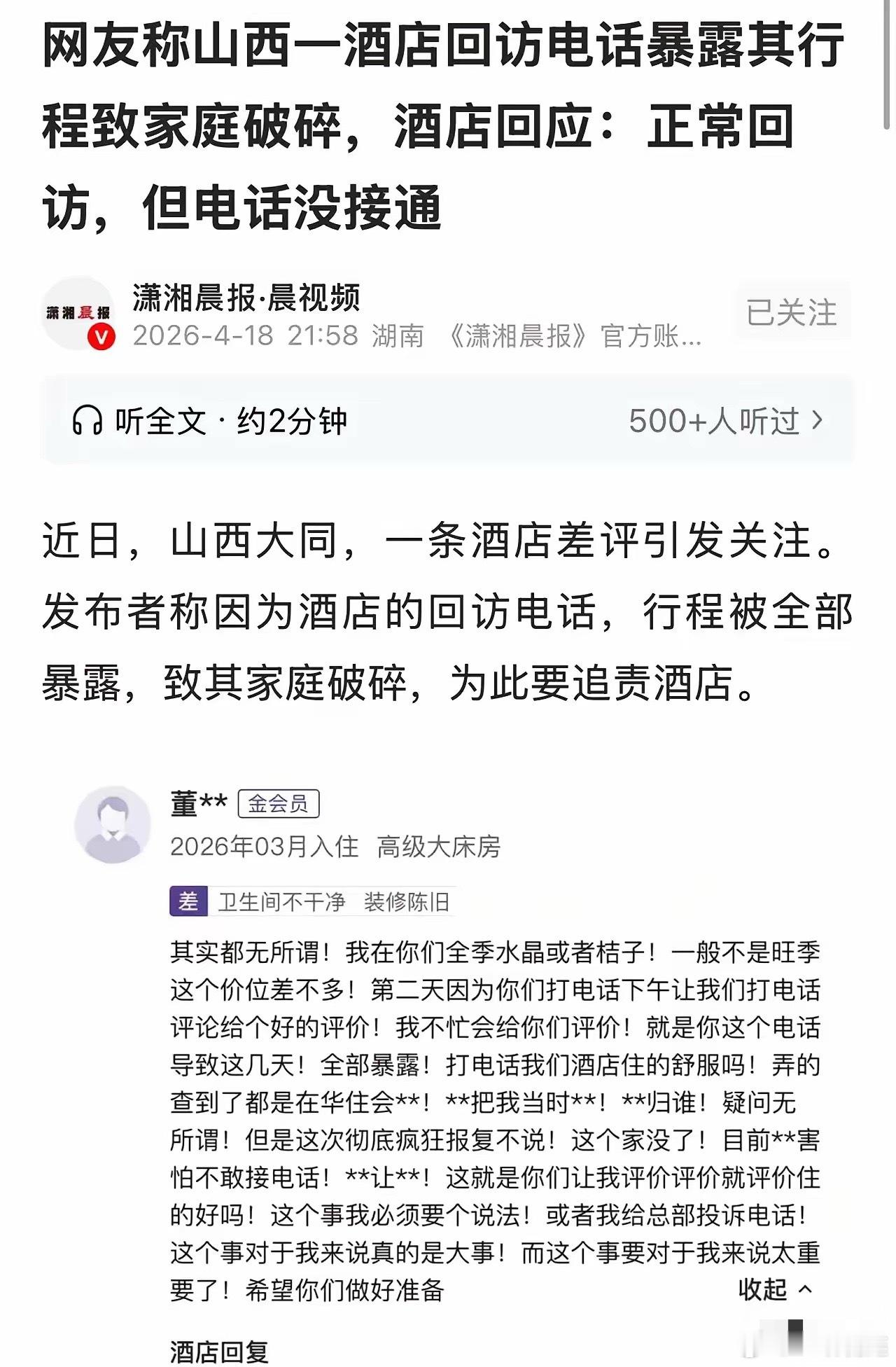 山西大同一董女士,哄骗老公说,自己因工作要出差几天,实则和情人去酒店开了几天房,她本以为这事神不知鬼不觉。结果退房第二天,酒店一通回访电话让她满意的话给好评,直接把她和情人开房的事给捅爆了。丈夫查了一下发现,她说出差的那几天实际上都是和情人开房去了。发现被绿了后,丈夫暴怒了,选择离婚,孩子也不给她,好好的家说散就散了。董女士赶紧打电话给情人,结果发现情人不接电话跑路了。气愤之余,董女士并没有反思自己,反手给酒店打了个差评,怪酒店的回访电话毁了她的家庭,还放话要酒店给说法!酒店都懵了,说自己就是正常回访,电话都没打通,这锅我们不背。董女士的脑回路也是够招笑的!自己婚内出轨搞婚外情,锅居然能甩到酒店身上!自己管不住下半身,就别赖别人流程太规范!就算没有酒店回访,早晚也得因为别的事翻车。现在家没了,全是自己作的,跟酒店有啥关系?大家说是不是这个道理?