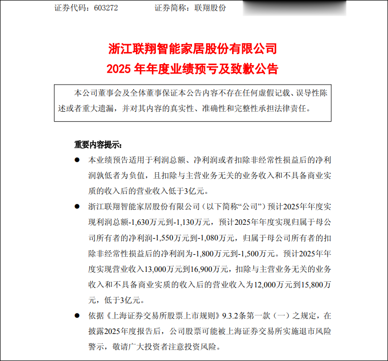 4月19日晚间,联翔股份(603272.SH)公告称,经财务部门初步测算,公司预计2025年度实现净利润为-1080万元至-1550万元,扣非后净利润为-1500万元至-1800万元;扣除与主营业务无关及不具备商业实质的收入后的营业收入为1.2亿至1.58亿元,低于3亿元。根据相关规定,若公司2025年年报披露后的利润总额、净利润或者扣除非经常性损益后的净利润孰低者为负值且营收低于3亿元,公司股票将在年报披露后被实施退市风险警示(简称前冠以“*ST”字样)。目前年报审计工作正在进行中,具体数据以正式披露为准,敬请投资者注意投资风险。