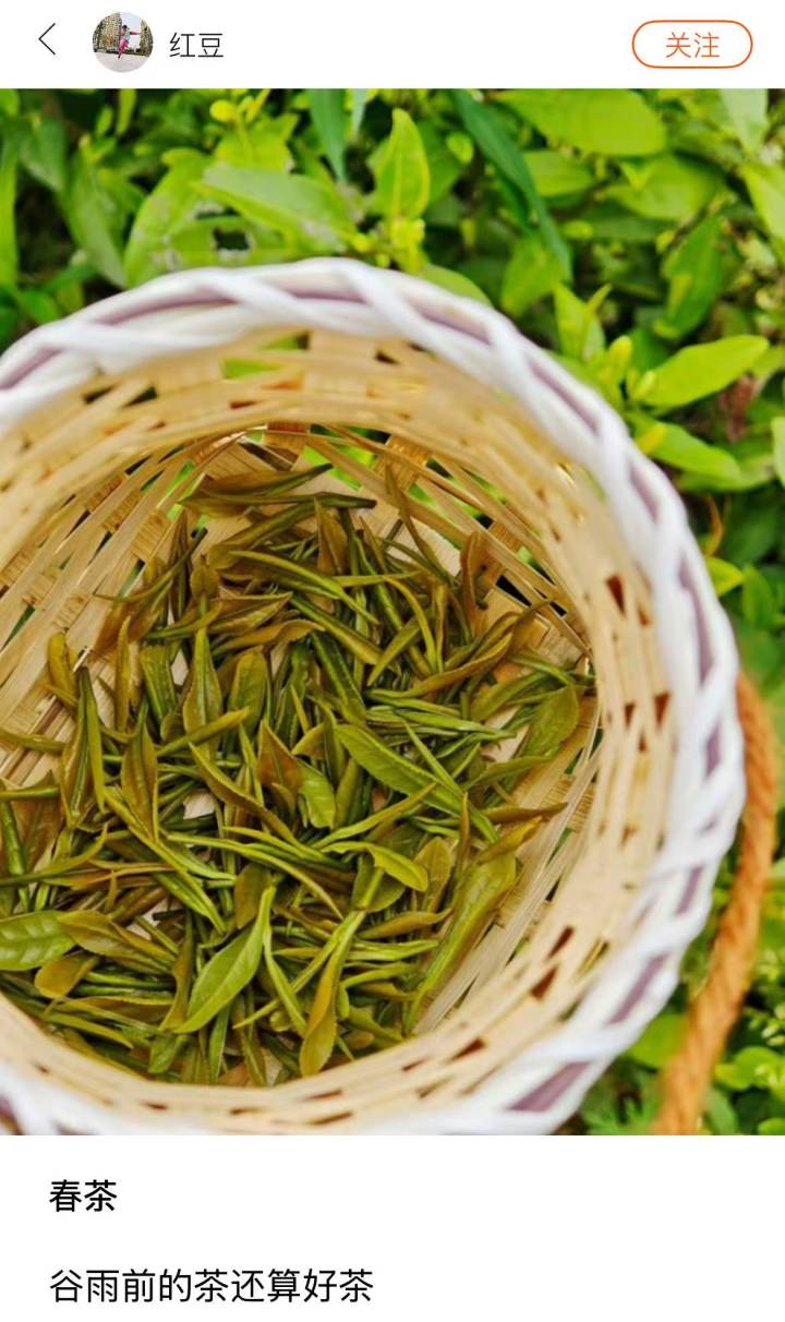 橙友“红五月”说:过了清明节,气温提升、阳光普照,有利于茶树生长,叶质也较为肥厚柔韧,不过这时的茶被称为雨前茶,身价不能和明前茶相比了。清明太早,立夏太迟,谷雨前后,其时适中。对江浙一带普通的炒青绿茶来说,清明后,谷雨前,是最适宜采制春茶的时节,从时间上分,明前茶是茶中的极品,雨前茶是茶中的上品,价格实惠,自己品尝性价比最高。