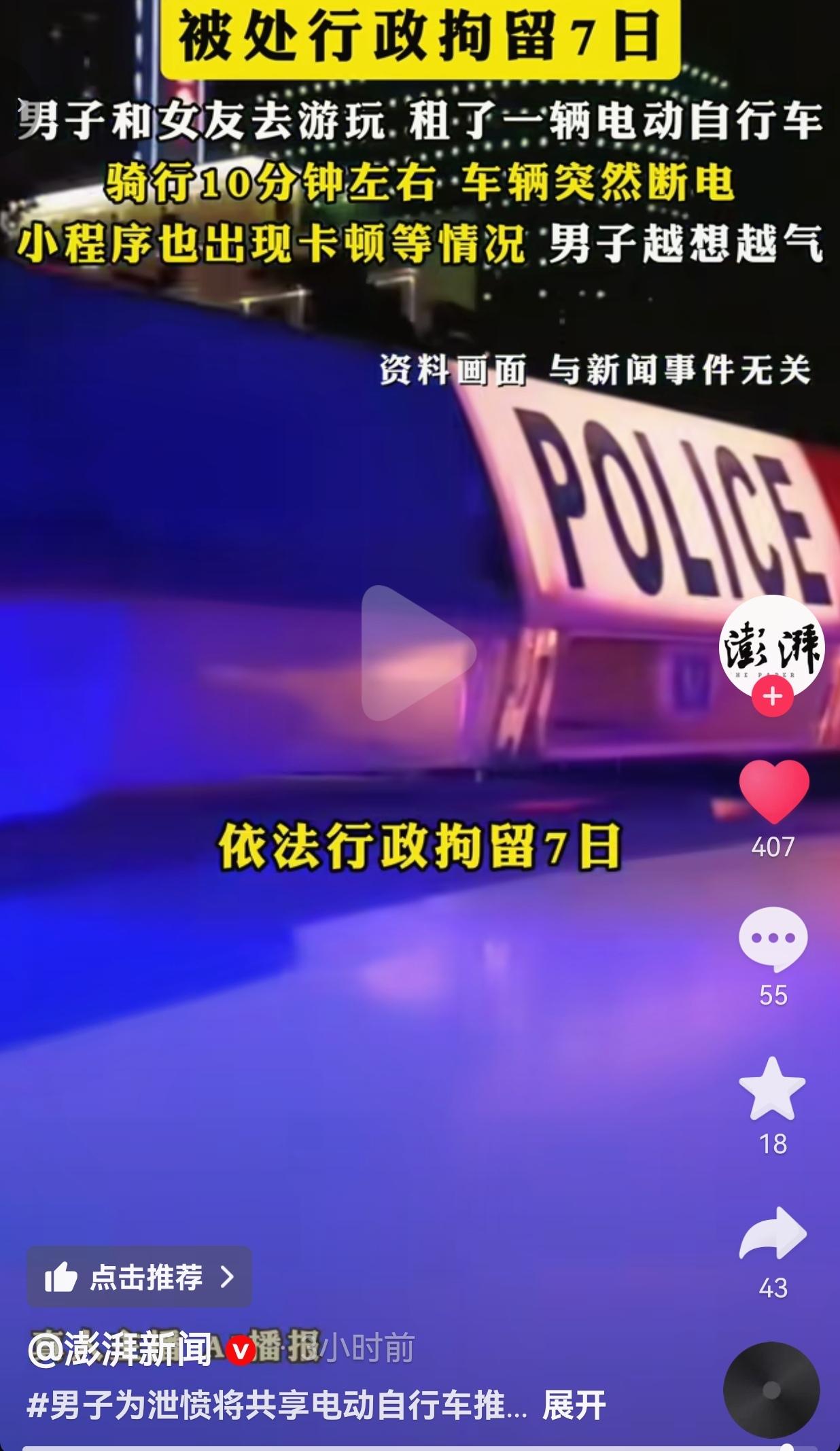 骑10分钟断电能忍?男子直接把共享电单车推下滇池,7天拘留套餐直接到手
