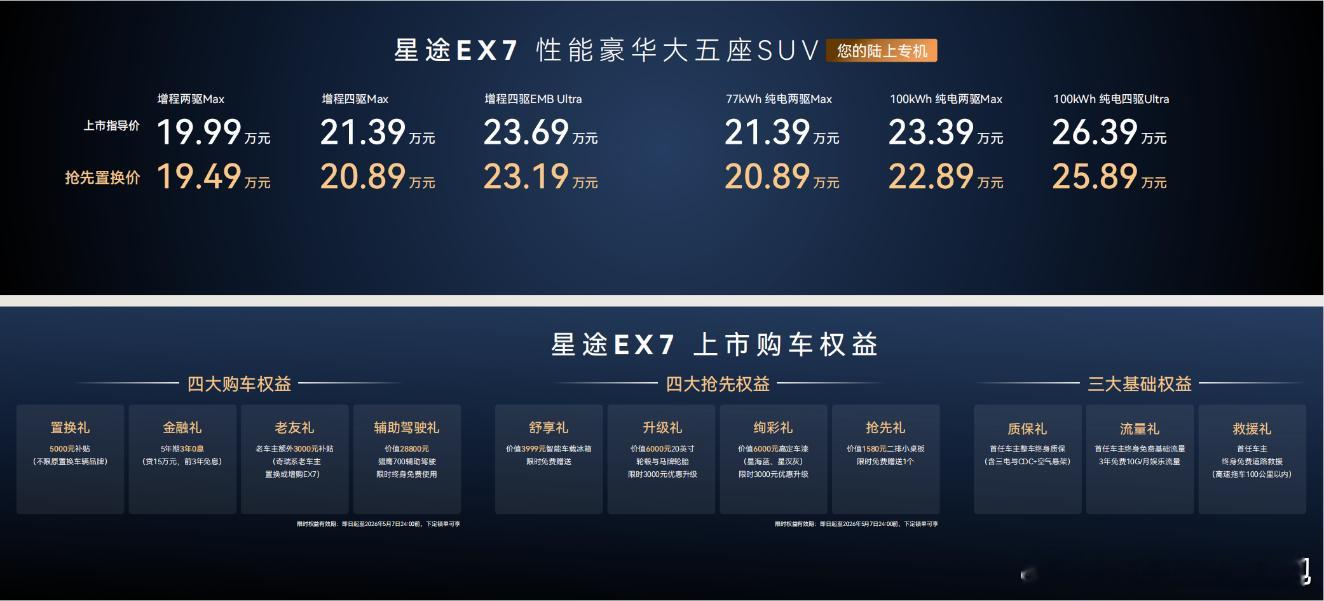 19.99万起!星途EX7上市,陆上专机正式启航最近车圈又出重磅新车,星途EX7正式在珠海上市,这款车定位性能豪华大五座SUV,直接被称作“陆上专机”,20万左右的价格,却能享受到远超同级的出行体验,看完配置真的让人很心动。作为星途高端系列的全新车型,这次EX7推出了纯电和增程两种动力,一共六款车型,官方售价19.99万到26.39万,置换的话还能再便宜,最低19.49万就能入手。而且购车福利特别多,置换、金融补贴都有,首任车主直接享受整车终身质保,还有终身免费基础流量和道路救援,售后完全不用操心,对普通家庭来说特别实在。很多人买车最看重好开、安全,星途EX7在这方面下足了功夫。它是全球首款搭载航空级EMB制动技术的车型,简单说就是刹车反应特别快,踩下去瞬间就能刹住,制动距离也更短,开车的时候安全感拉满,就算开快了也能稳稳停下。同时车子动力很强,四驱版加速超快,底盘调校也很扎实,过弯不飘、走烂路不颠,不管是日常上下班、接送孩子,还是自驾跑长途,开着都很舒服顺手。智能方面也不用担心里程碑,全车标配高阶智能驾驶,跑高速、走市区都能辅助驾驶,不用自己一直紧绷着。停车难的问题也彻底解决,不管是窄车位、地下车库,都能自动泊车,就算是开车新手也能轻松搞定。车内大屏清晰流畅,语音控制特别灵敏,不用动手就能操控空调、导航、音乐,日常用起来非常方便。家用买车,空间和舒适度也很关键。星途EX7车身尺寸够大,五座布局空间特别宽敞,后排坐三个人也不挤,储物空间多,日常杂物、出行行李都能放下。车内座椅舒服,通风、加热、按摩功能全都有,还有车载冰箱,夏天放冷饮、冬天放热水都方便。车内用料环保没有异味,隔音效果也好,坐在车里就像坐头等舱一样惬意。安全上更是不用多说,车身用料扎实,高强度钢材占比高,碰撞安全性能达标,电池也经过严格测试,不怕起火爆炸,全方位保护车上家人的安全。这款车还有专业赛道技术背书,多位世界冠军都认可,实力经得起考验。总的来说,星途EX7不到20万起的价格,却拥有强劲动力、智能科技、超大空间和全面安全,性价比在同级车里格外突出,不管是追求驾驶体验,还是看重家用实用,这款车都很值得一看,妥妥的20万级SUV优选。性能豪华大五座SUV星途EX7正式上市全球首发航空级EMB线控制动星途EX7你的陆上专机正式启航