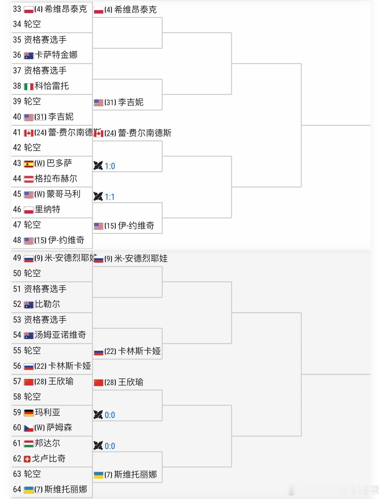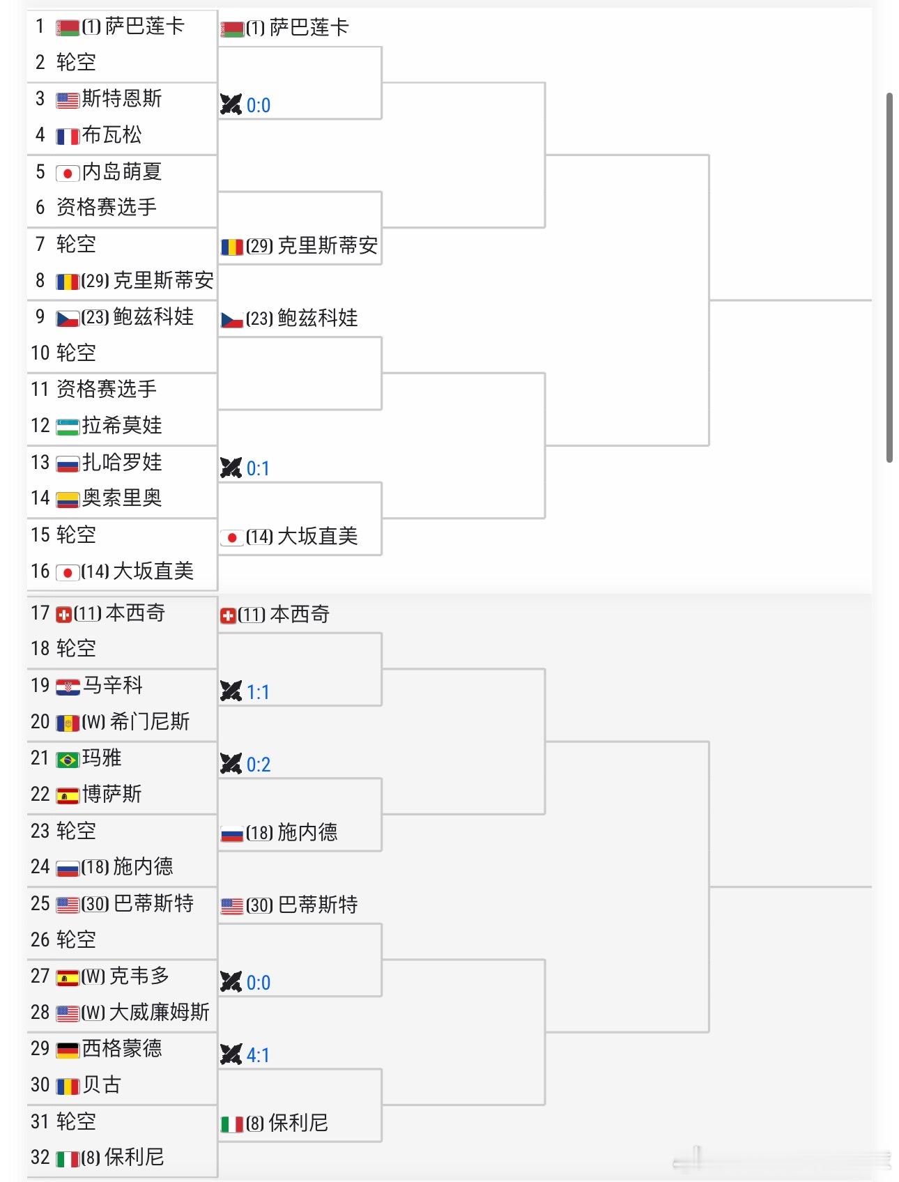 大种子对位【1】萨巴伦卡🇧🇾vs【8】保利尼🇮🇹【4】斯瓦泰克🇵🇱vs【7】斯维托丽娜🇺🇦