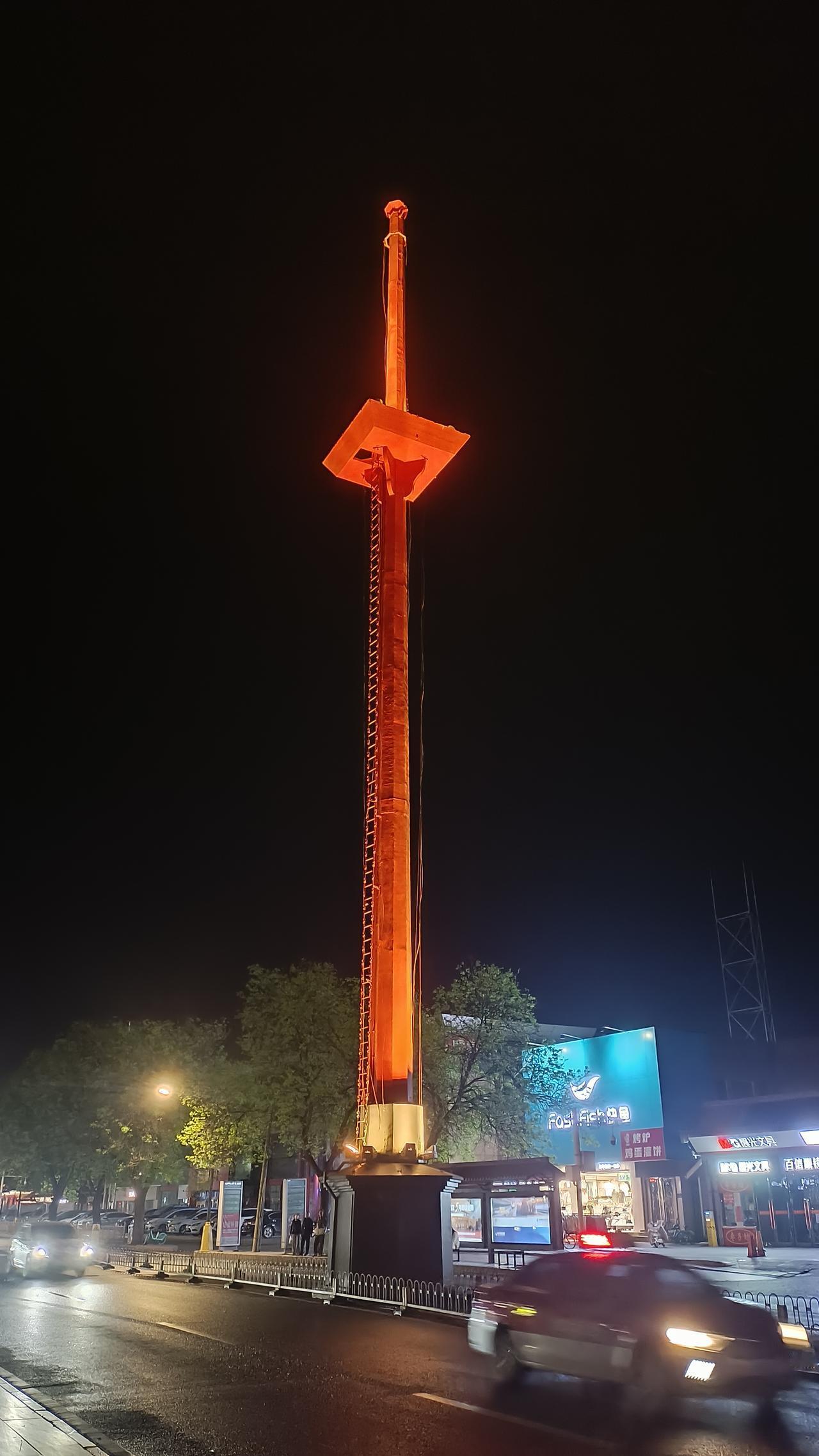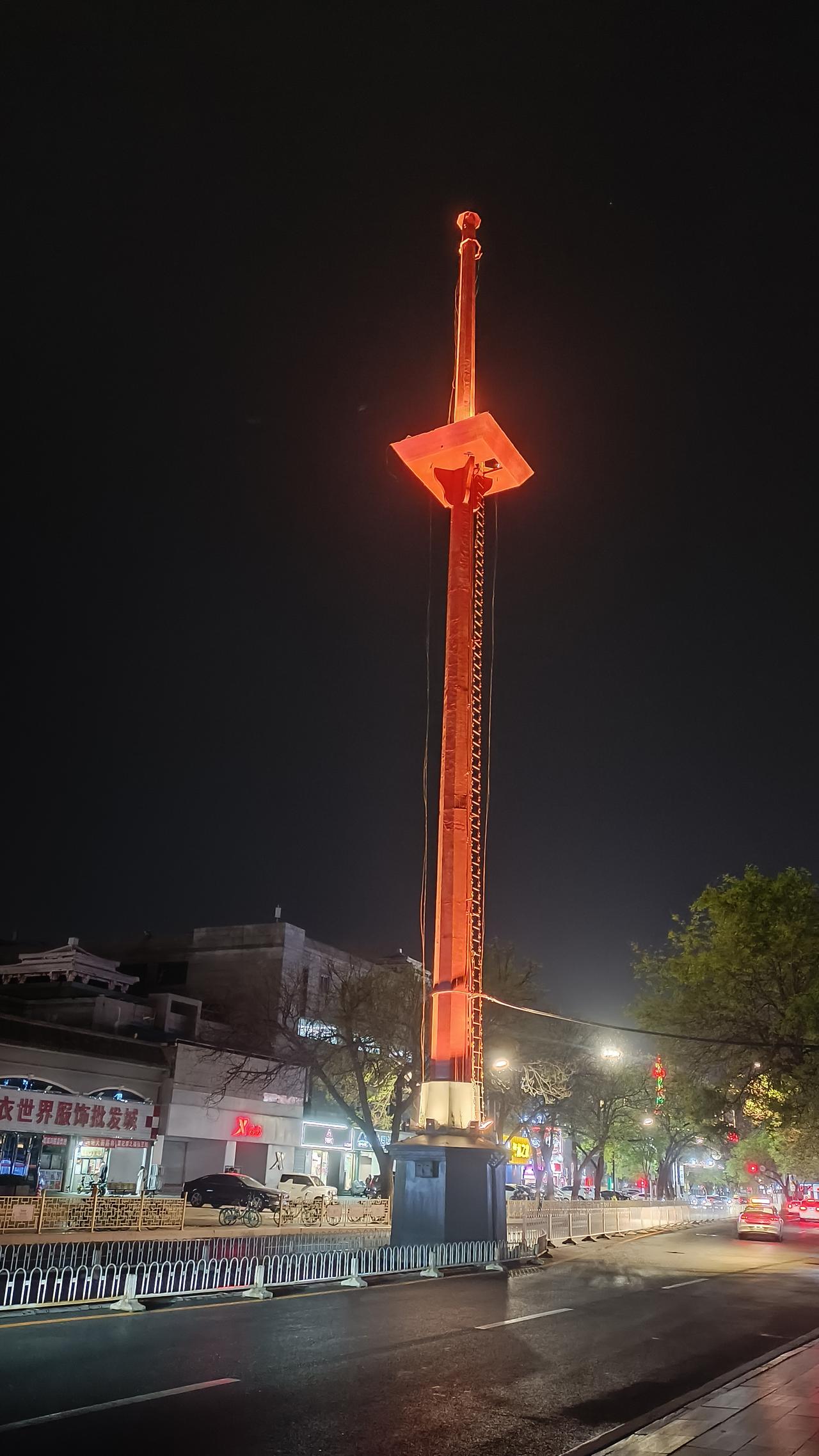 直隶总督署的两座大旗杆悄然点亮,红彤彤的,在夜晚格外醒目。今夜灯光一打,那熟悉的朱红色仿佛被注入了活力——这两根自明代便已矗立、一度为全国之最的旗杆,此刻正静静与春雨后的现代街巷对话。