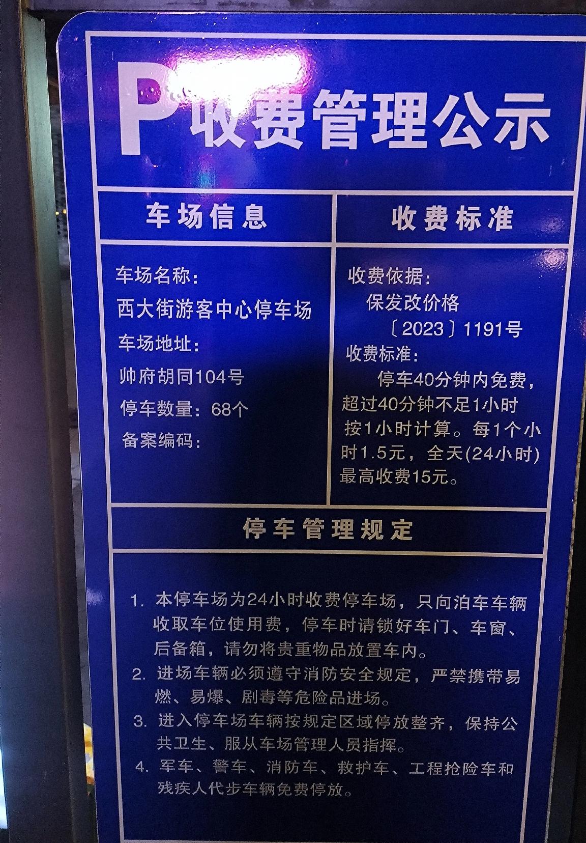 听网上说西大街新建了一座停车场,晚上就去看了一下。它的位置在西大街与帅府胡同交叉口北行50米,叫西大街游客中心停车场,是个地下停车场 ,车位数68个。
