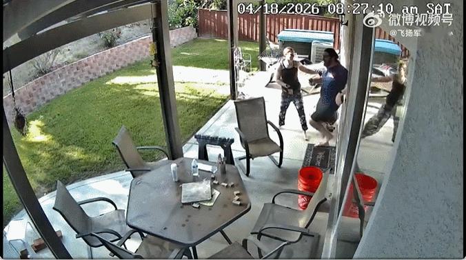 这位男子名叫亨特·佩林(Hunter Perrin)。他说,周六早上他正在看电视,这时邻居敲了他的前门。“我们走到后院一看,那里有个吊篮,里面坐着13个人,就这么待在后院里盯着我们看,”佩林说。