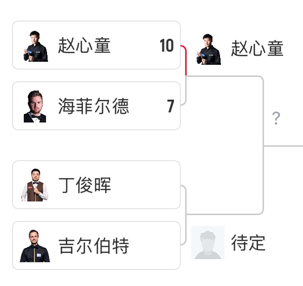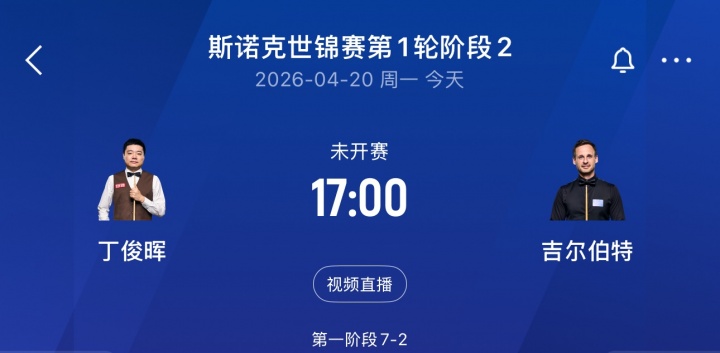 直播吧04月20日讯2026斯诺克世锦赛第1轮,卫冕冠军赵心童率先晋级16强,静候丁俊晖vs大卫·吉尔伯特的胜者。