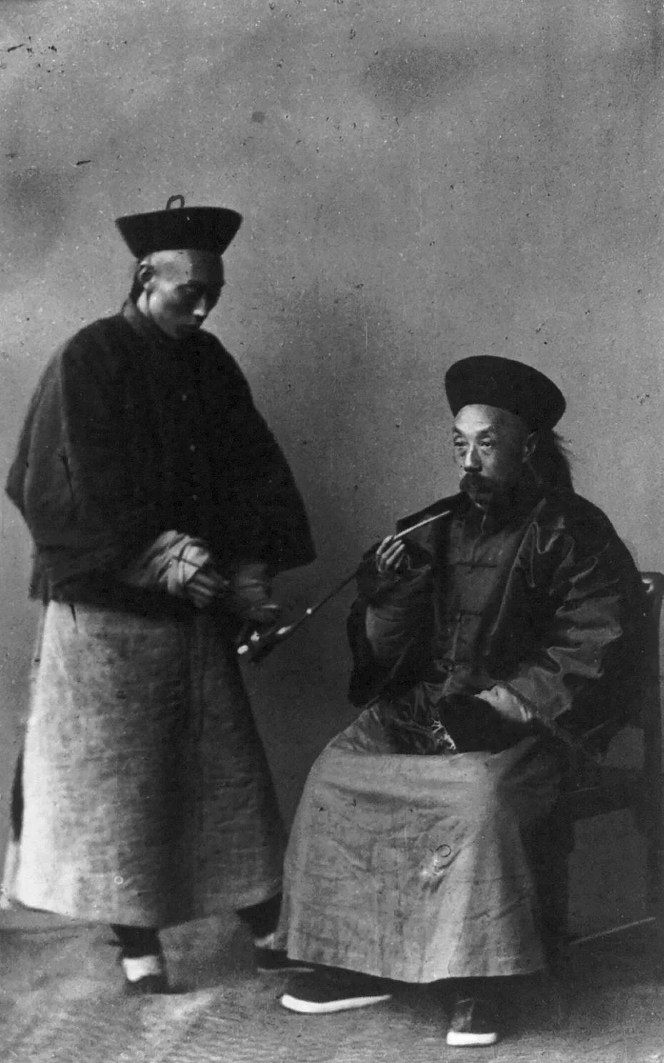 这是晚清上海道台(苏松太兵备道)与随身差役的肖像老照片,端坐的道台是彼时上海最高