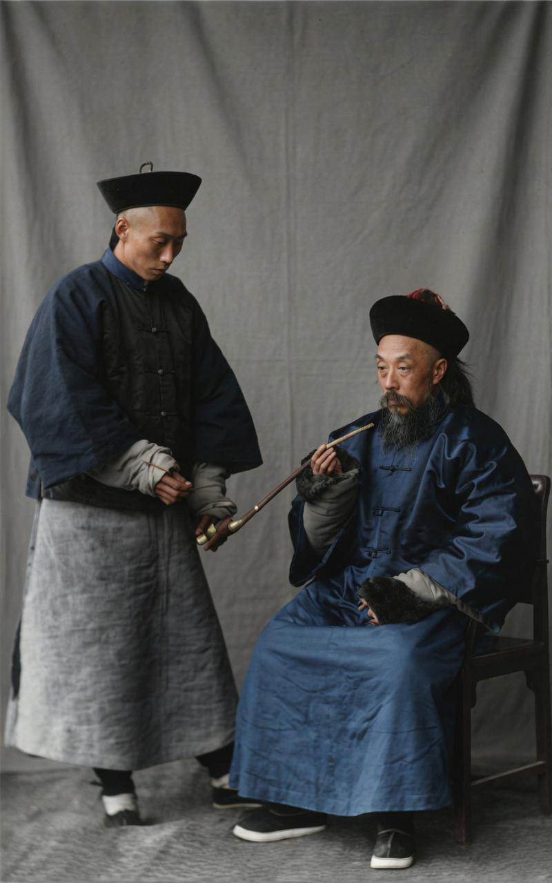这是晚清上海道台(苏松太兵备道)与随身差役的肖像老照片,端坐的道台是彼时上海最高地方长官,官帽顶戴完整,一身命官袍服,手握地方大权;身旁站立的差役,帽上仅有固定线扣,无半分顶珠。清代礼制分明:无顶珠者,便无官品,身为不入流的衙署扈从,无官阶无俸禄,只可随行侍奉。