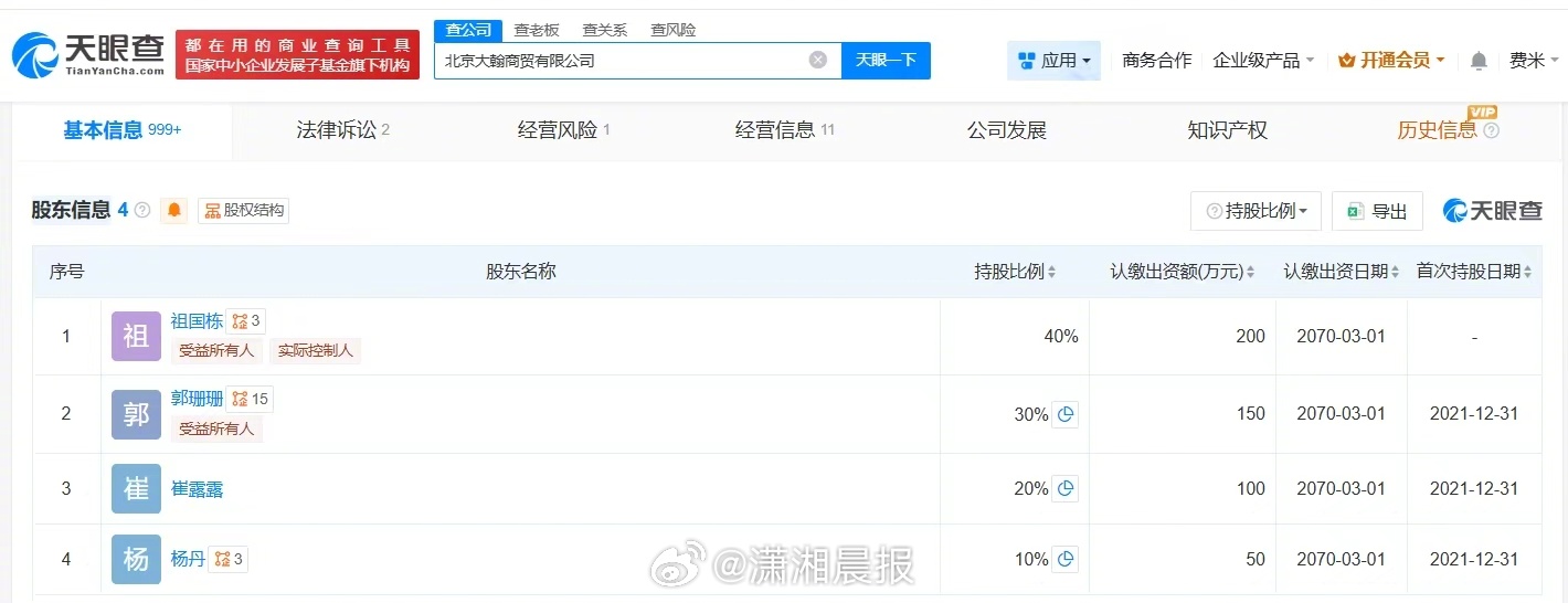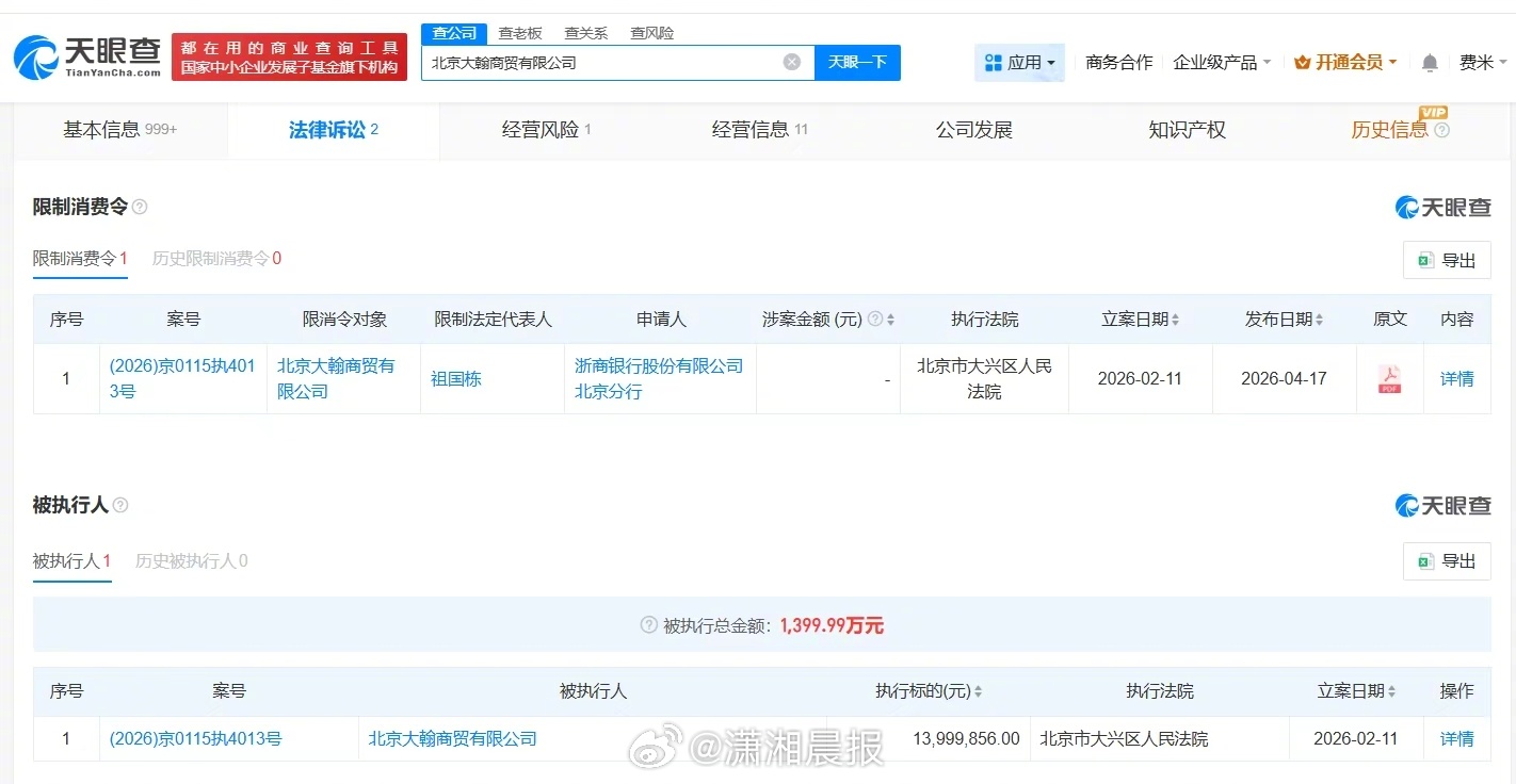 #嘎子哥妻子关联公司被限消#【#嘎子哥妻子公司因1399万案款被限消#】记者查询天眼查法律诉讼信息发现,近日,北京大翰商贸有限公司及其法定代表人祖国栋新增一则限制消费令,执行法院为北京市大兴区人民法院,案件流程信息显示,此前,该公司已因此案被执行1399万余元。该公司成立于2021年3月,注册资本500万人民币,经营范围包括食品经营、租赁建筑机械设备、烟草制品零售等,由祖国栋、嘎子哥妻子郭珊珊等共同持股。