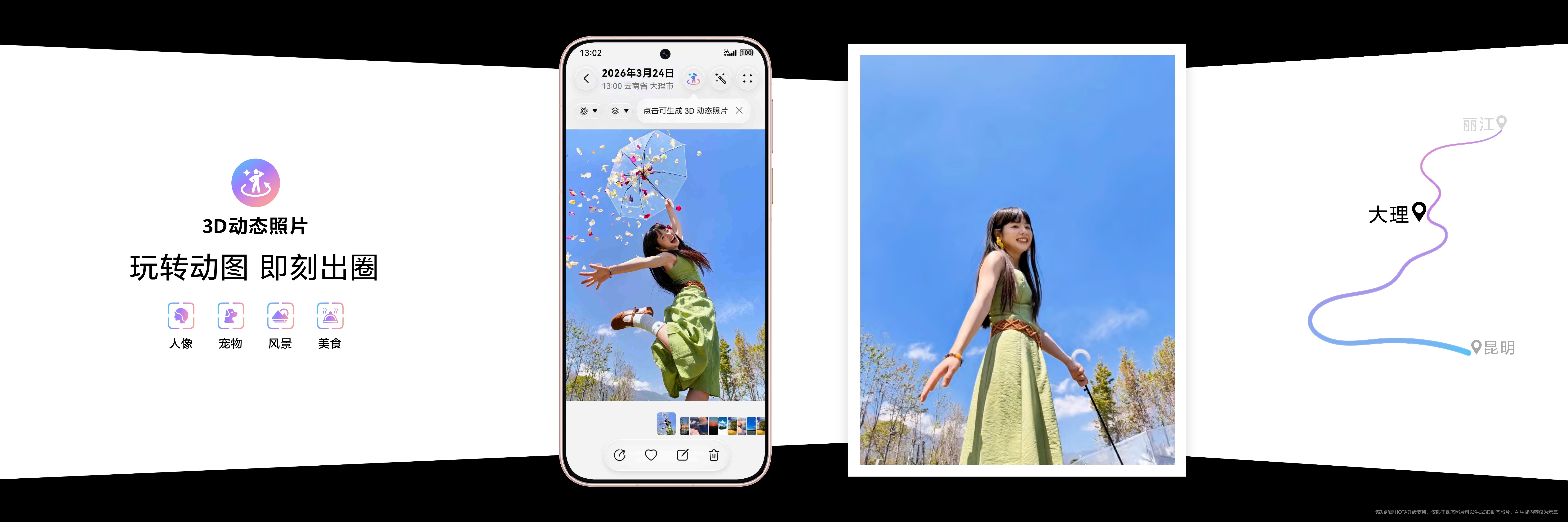 华为Pura90发布XMAGE智拍 XMAGE智拍超有意思!不知道咋拍直接问小艺!拍人像的不知道怎么摆姿势,AI 就会推荐姿势,看到喜欢的姿势,也可以把照片导进就能更着拍!6大人像精准配方直接拿捏!3D动态照片巨好玩,抓拍的精彩瞬间能拍出3D立体的感觉,拍旅行大片非常轻松,是不是超赞!