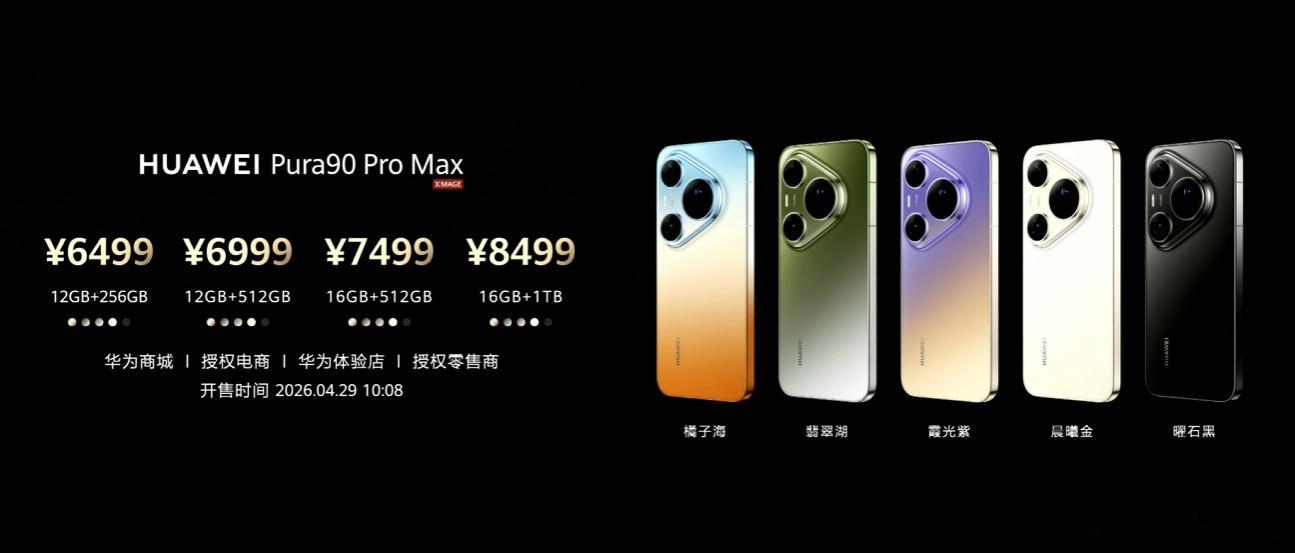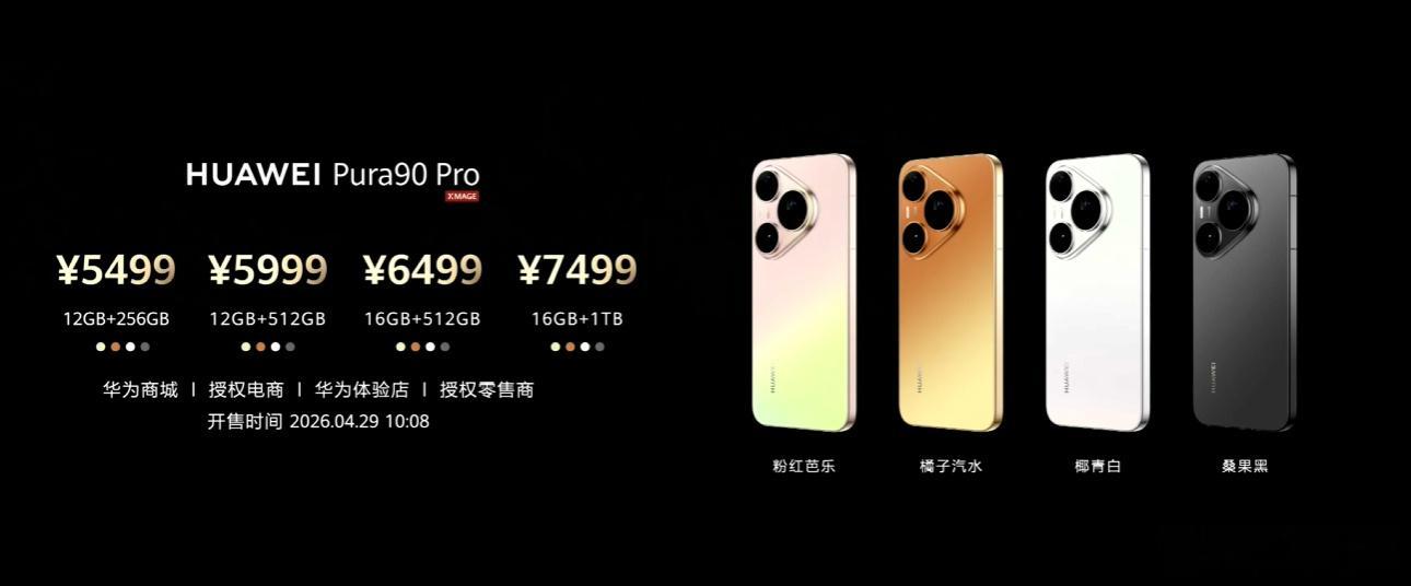华为Pura90Pro:12GB+256GB:5499元;12GB+512GB:5999元;16GB+512GB:6499元;16GB+1TB:7499元;