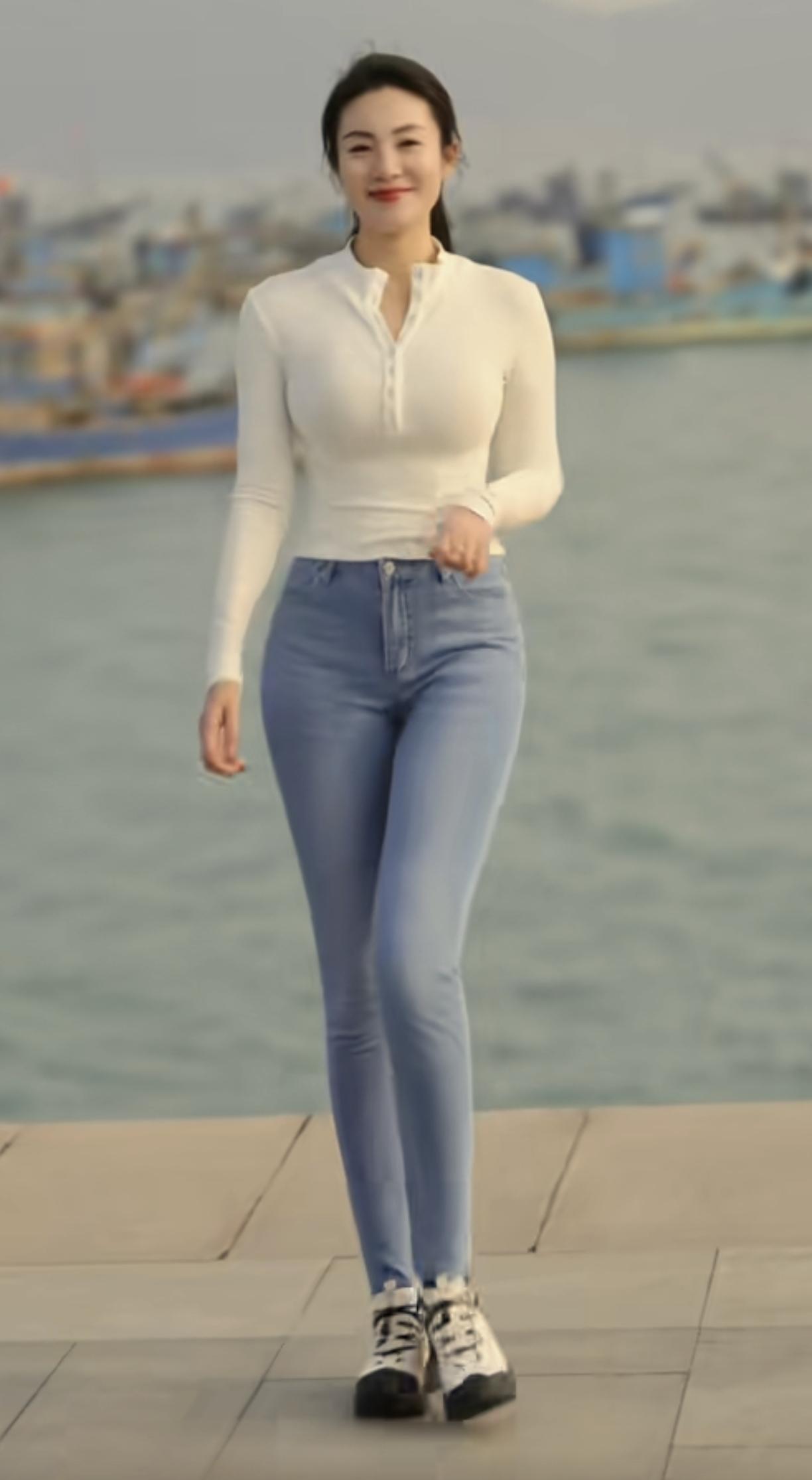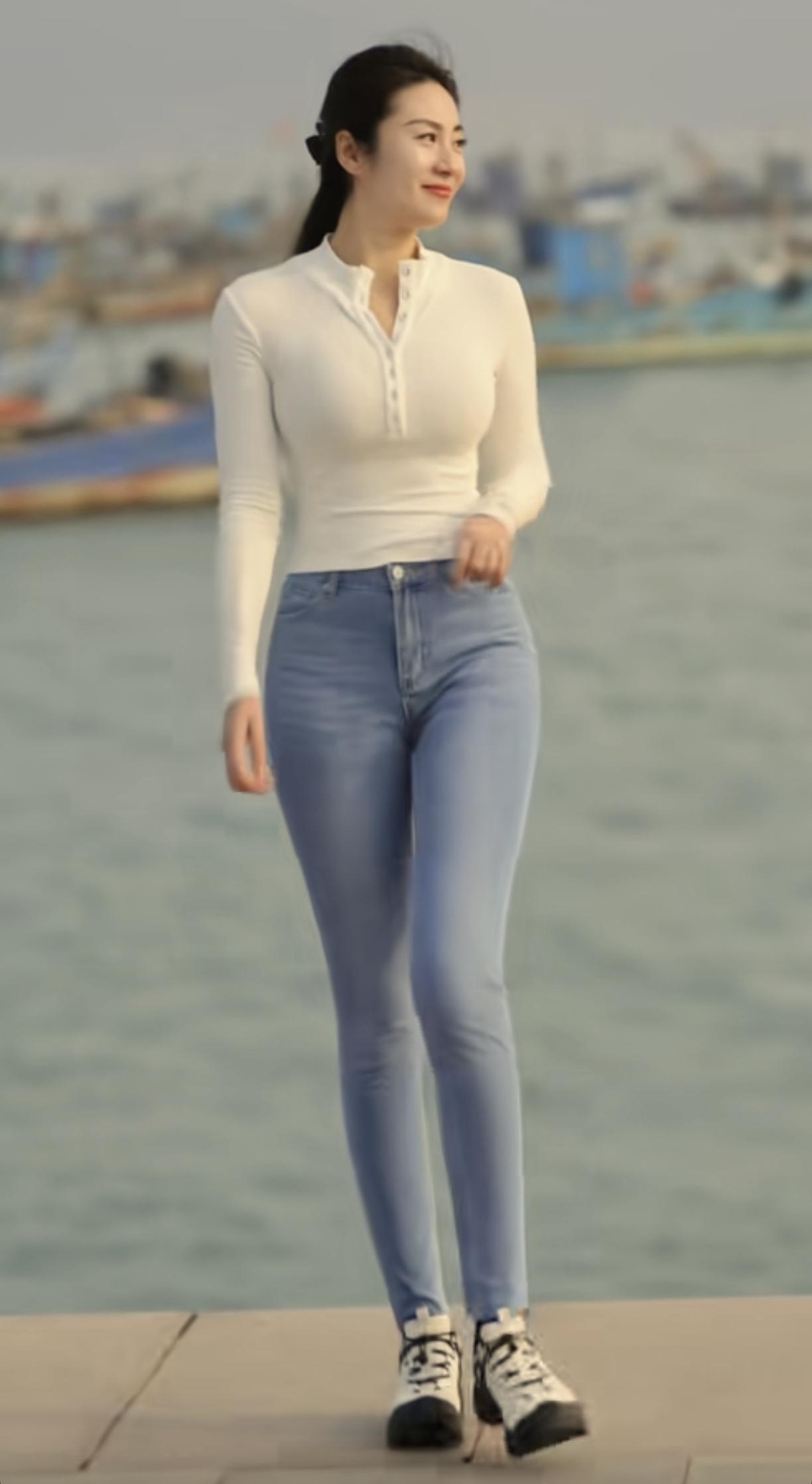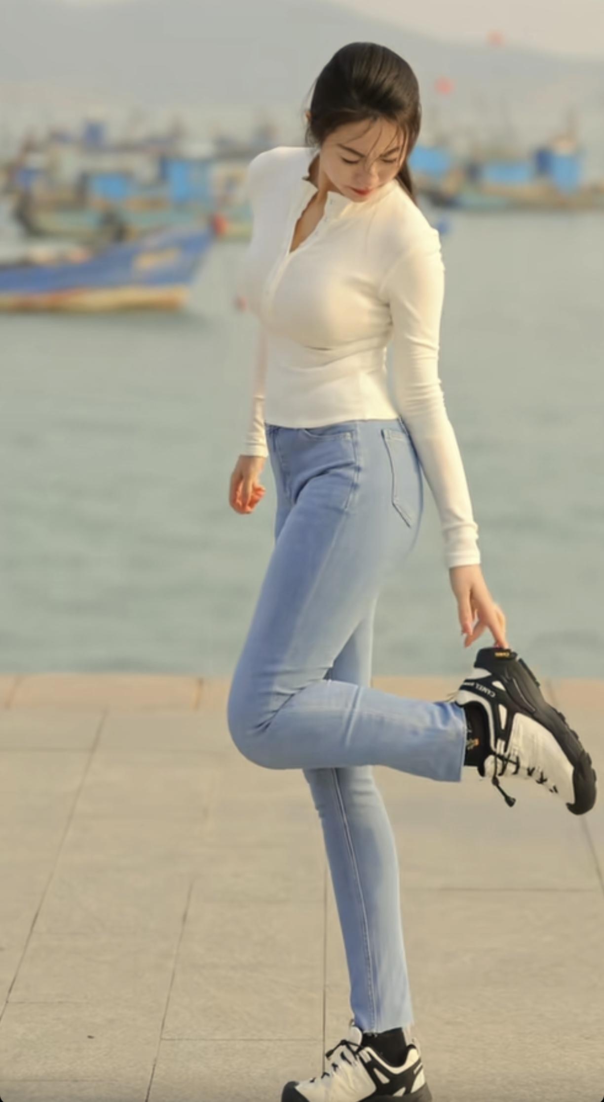 海边漫步,白色上衣+牛仔裤,轻松自在。海边风光穿搭 海边蓝色系穿搭 女孩为什么热衷于海边拍照?