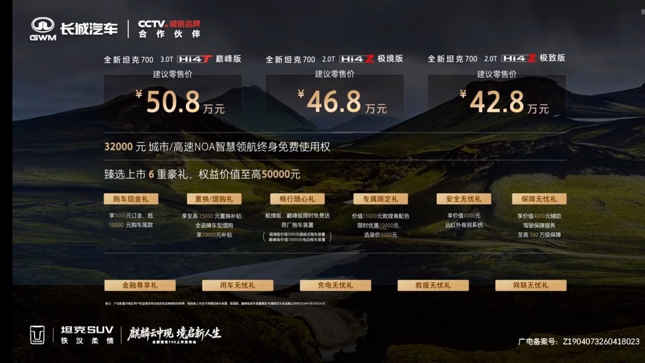 车盟快讯:炸场!全新坦克700正式上市,官方指导价42.8万-50.8万,比预售直降1万!作为硬派越野旗舰,新车搭载非承载式车身,采用麒麟设计+激光大灯气场拉满。更有双动力加持:2.0T插混(续航1191km)、3.0T V6插混(综合功率385kW)。内饰豪华拉满,配后排娱乐屏、车载冰箱;首搭激光雷达+VLA大模型,硬派也有高阶智驾!这个价格 大家觉得香不香?