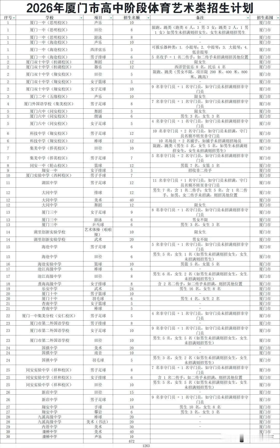 那么今天厦门发布了 2026 年中考体育、艺术招生计划,唐老师统计了一下,总共有 672 人招生。