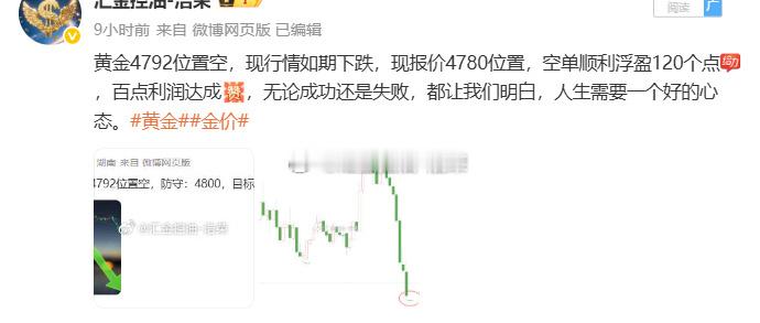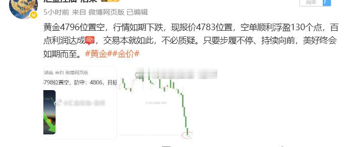 截至目前,已斩获四连胜。交易从没有看不清的方向,只有不愿突破、不肯改变的人。做单没有橡皮擦,开仓即定局,落笔无更改。扛得住旁人扛不住的压力,守得住常人守不住的坚持,才能赚到别人赚不到的利润,看见市场中别人看不见的风景。黄金金价外汇原油
