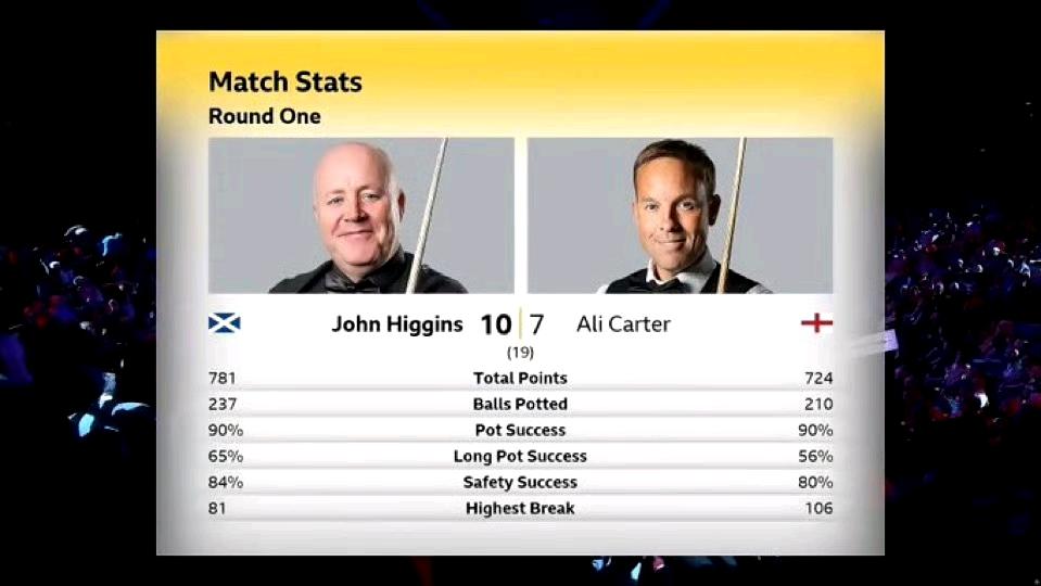 希金斯10-7击败卡特晋级世锦赛16强,静候奥沙利文,火箭将于今天对阵国强。