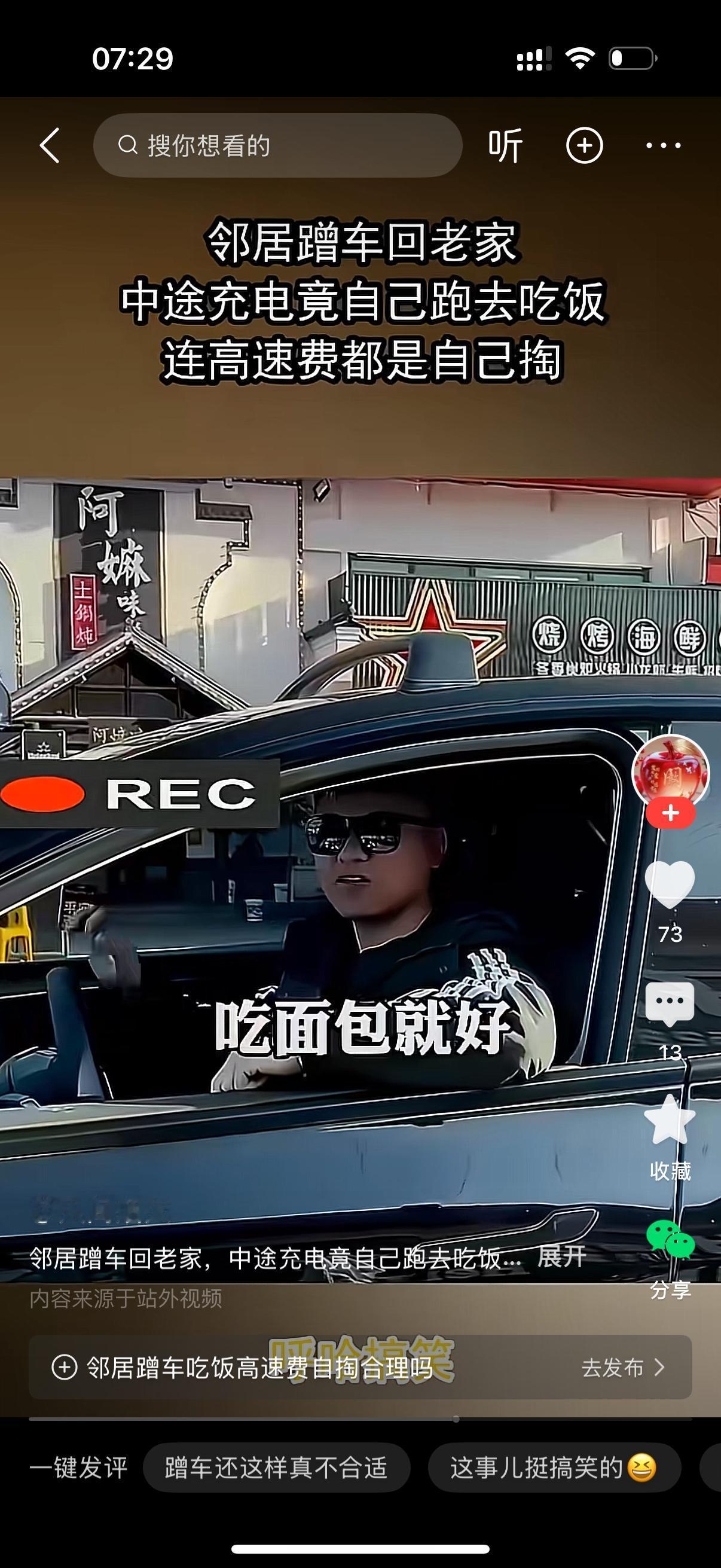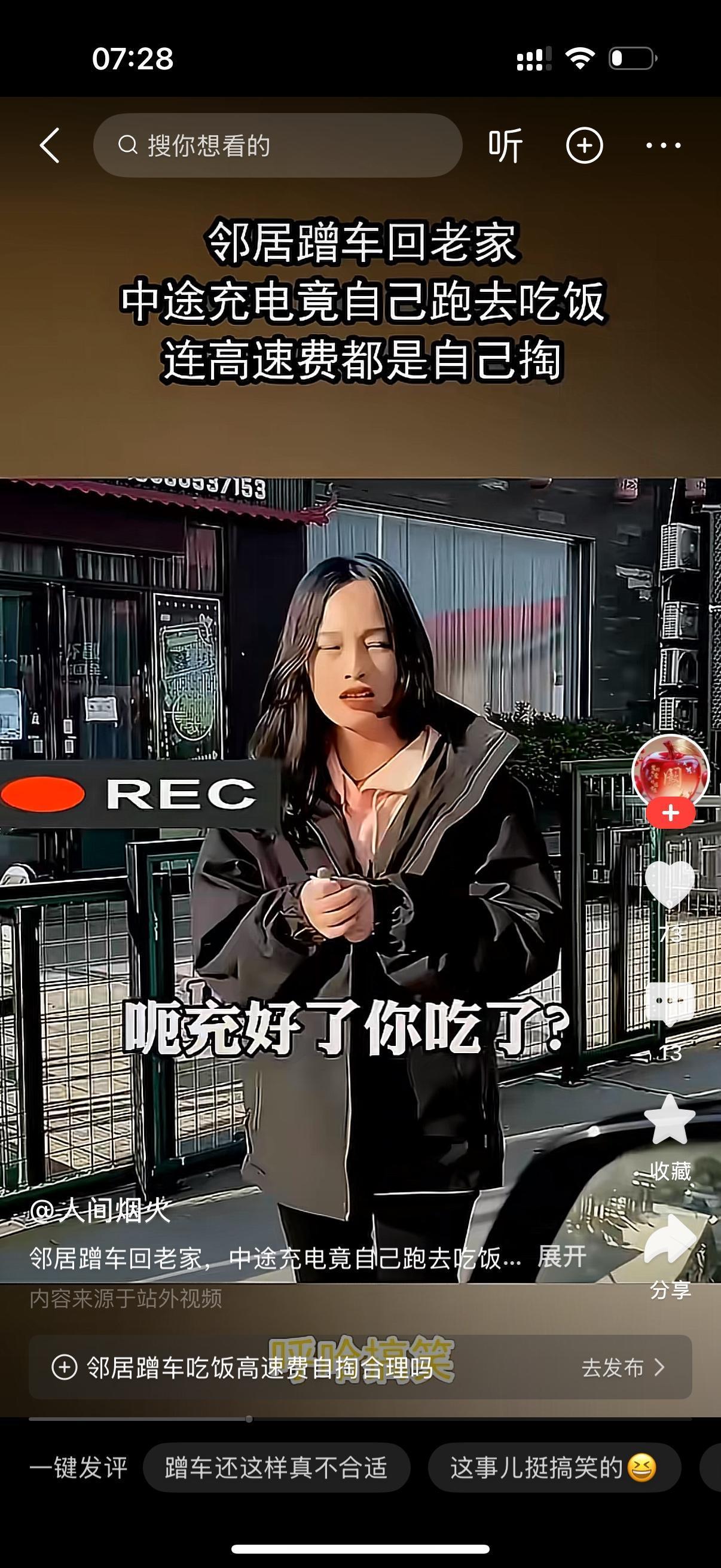 女子蹭邻居男子的车回老家。中途男子的车要充电,女子没有叫男子一起,一个人不声不响地跑去吃饭。女子吃女子吃完饭回来问男子,你电充好了吗?男子故意问,嗯充好了,你吃了吗?女子说,我吃过了,你也去吃吧。男子黑着脸说,我吃面包就好。这样的女子不是不懂,就是抠门,她蹭车,证明喜欢占便宜。