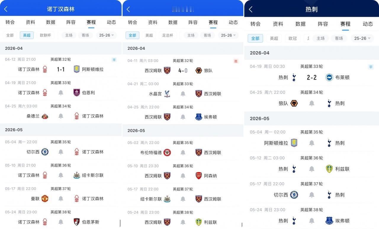 目前英超最后一个降级名额应该就在森林、西汉姆和热刺三选一了。