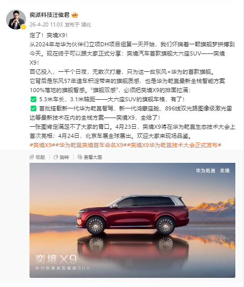作为东风与华为乾崑联合打造的首款车型,奕境X9凭借“央企制造底蕴+科技巨头全栈”的组合,强势入局9系旗舰SUV阵营。东风57年造车积淀赋予其硬核旗舰质感:5.3米车长与3.1米轴距的磅礴尺寸、全域800V架构带来纯电850km/增程超1200km续航、双腔空悬+CDC保障极致舒适驾控,以坚实底盘筑牢新王根基。华为乾崑则以100%全栈方案注入旗舰智感:搭载全球量产最高规格的896线双光路图像级激光雷达、新一代乾崑智驾ADS、新一代鸿蒙座舱及乾崑全维防碰撞CAS5.0等,实现智驾与座舱体验的全面跃升。双方深度协同、百亿投入,为奕境9系新王的实力加冕。华为乾崑奕境首车命名X9年度9系旗舰华为乾崑首款旗舰SUV华为再造旗舰9系9系新王奕境X9华为乾崑技术大会正式发布华为乾崑奕境首车命名X9