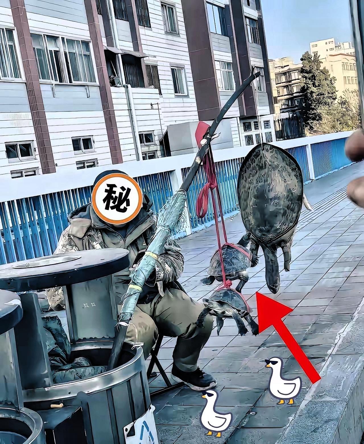 不少路口都能看见这群人,一身尘土拿着绑着红绳的甲鱼,看着像朴实的乡下老农,让人看着心生怜悯。