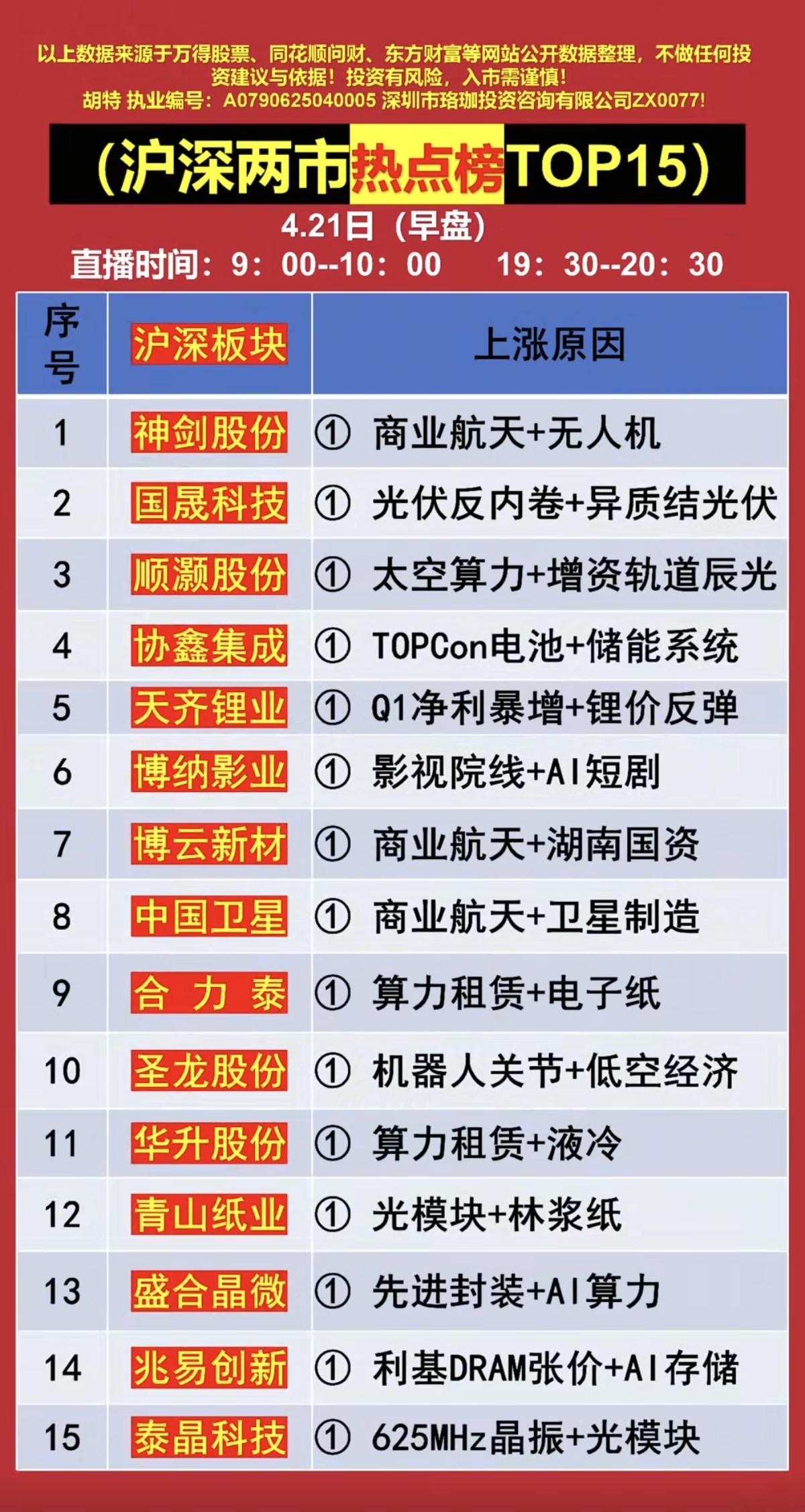 4.21周二市场热点方向+投资逻辑!1.商业航天2.光通信3.液冷服