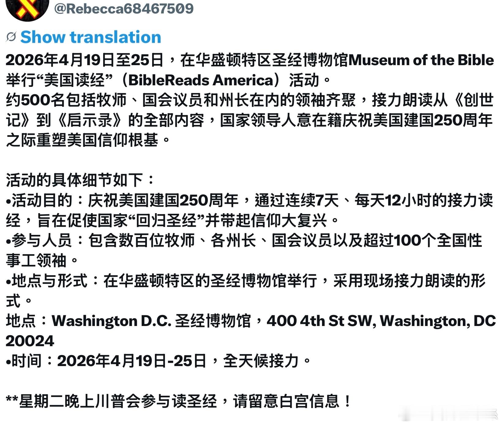 2026年4月19日至25日,在华盛顿特区Bible博物馆Museum of the Bible举行“美国读经”(BibleReads America)活动。约500名包括牧师、国会议员和州长在内的领袖齐聚,接力朗读从《创世记》到《启示录》的全部内容,国家领导人意在籍庆祝美国建国250周年之际重塑美国信仰根基。