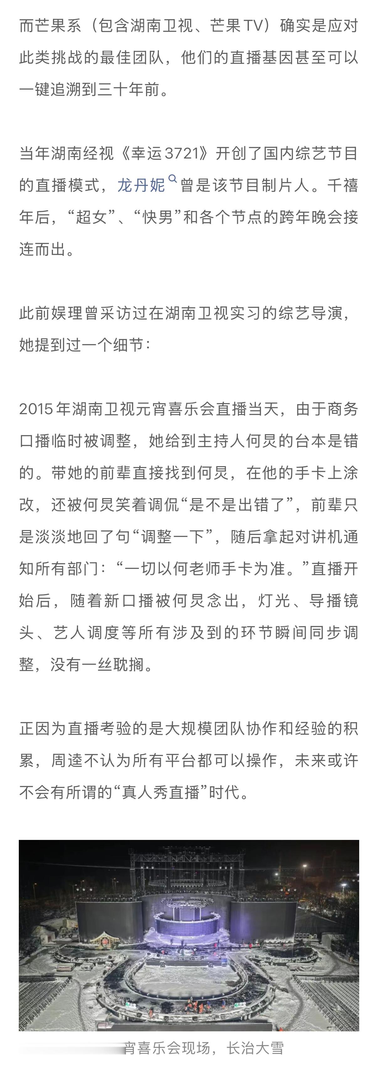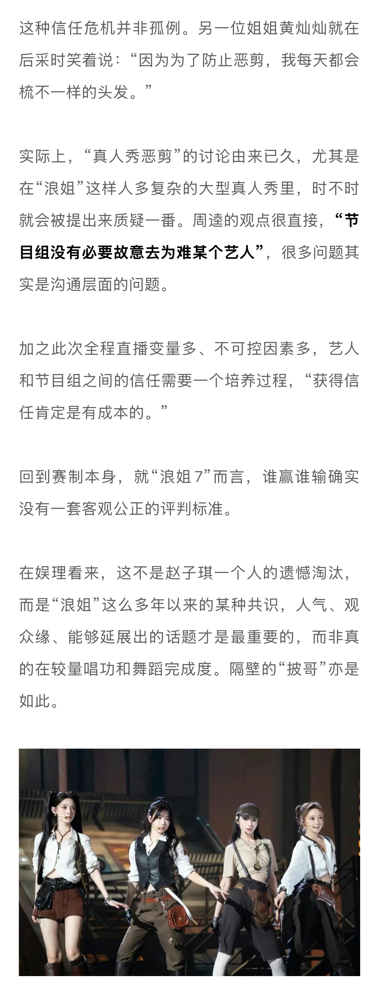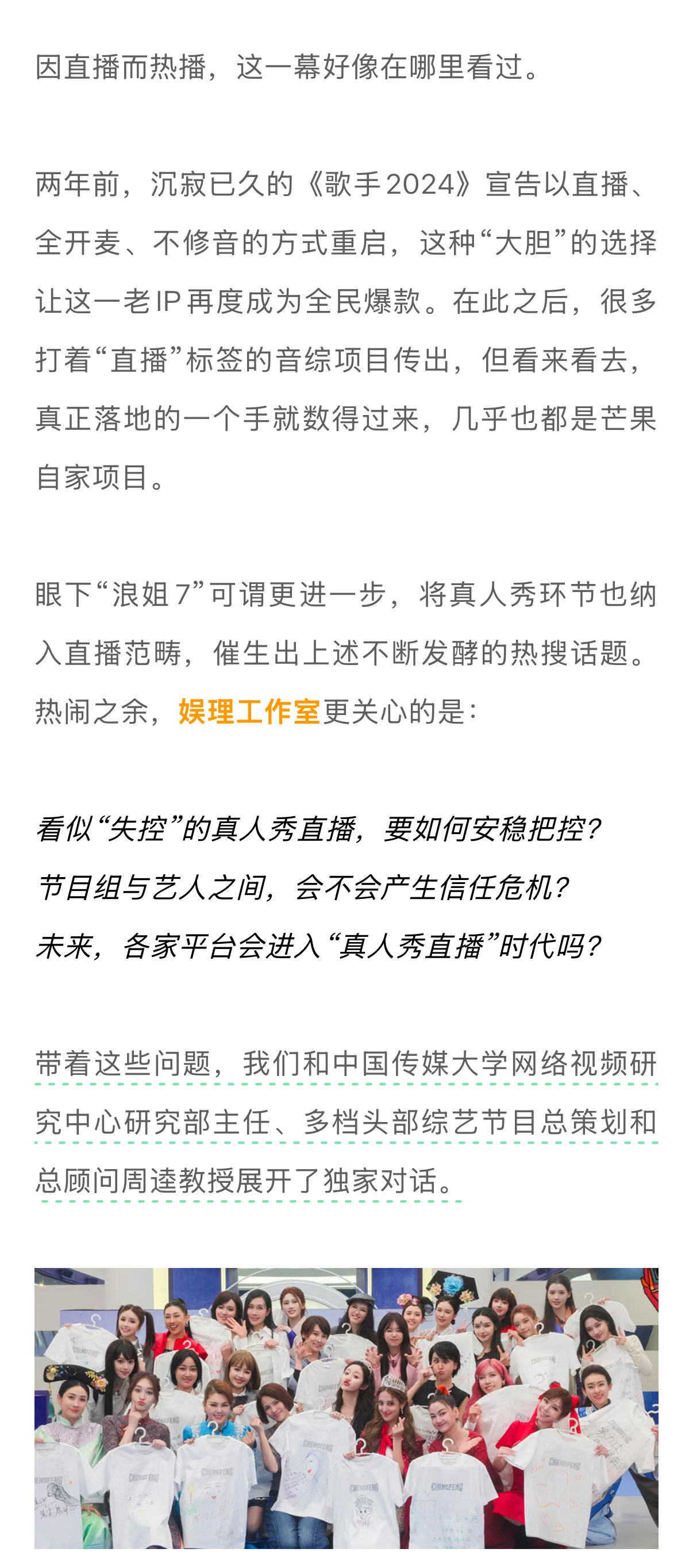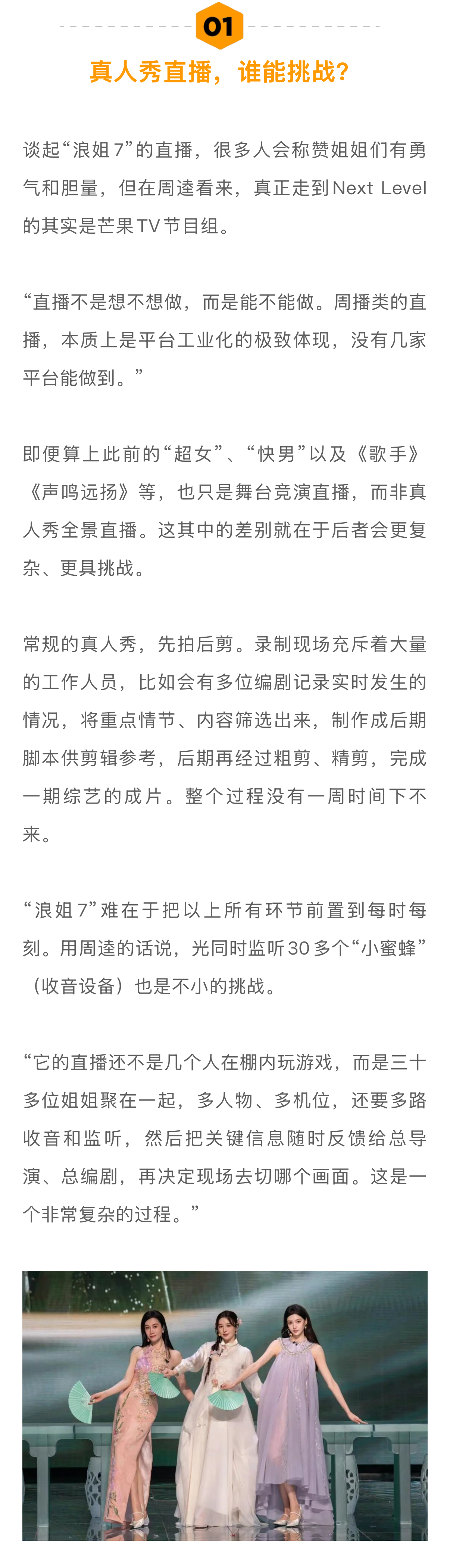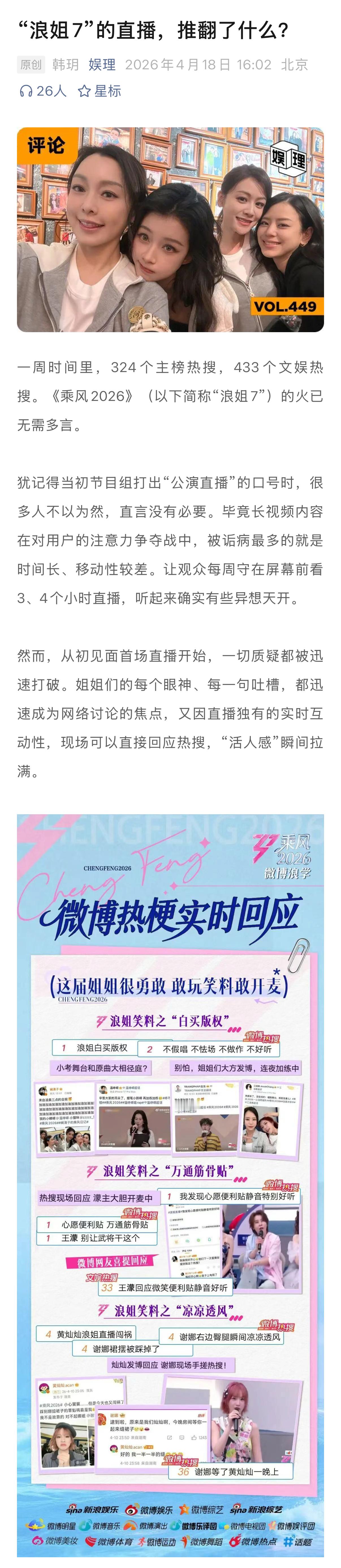 学者谈浪姐7直播难度何炅直播主持功力 一周时间里,324个主榜热搜,433个文娱热搜。《乘风2026》的火已无需多言。眼下“浪姐7”可谓更进一步,将真人秀环节也纳入直播范畴,催生出上述不断发酵的热搜话题。热闹之余,我们更关心的是:看似“失控”的真人秀直播,要如何安稳把控?节目组与艺人之间,会不会产生信任危机?未来,各家平台会进入“真人秀直播”时代吗?带着这些问题,新浪娱乐工作室和中国传媒大学网络视频研究中心研究部主任、多档头部综艺节目总策划和总顾问周逵教授展开了独家对话…娱理独家↓