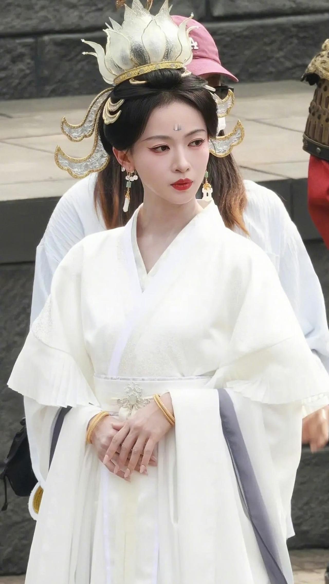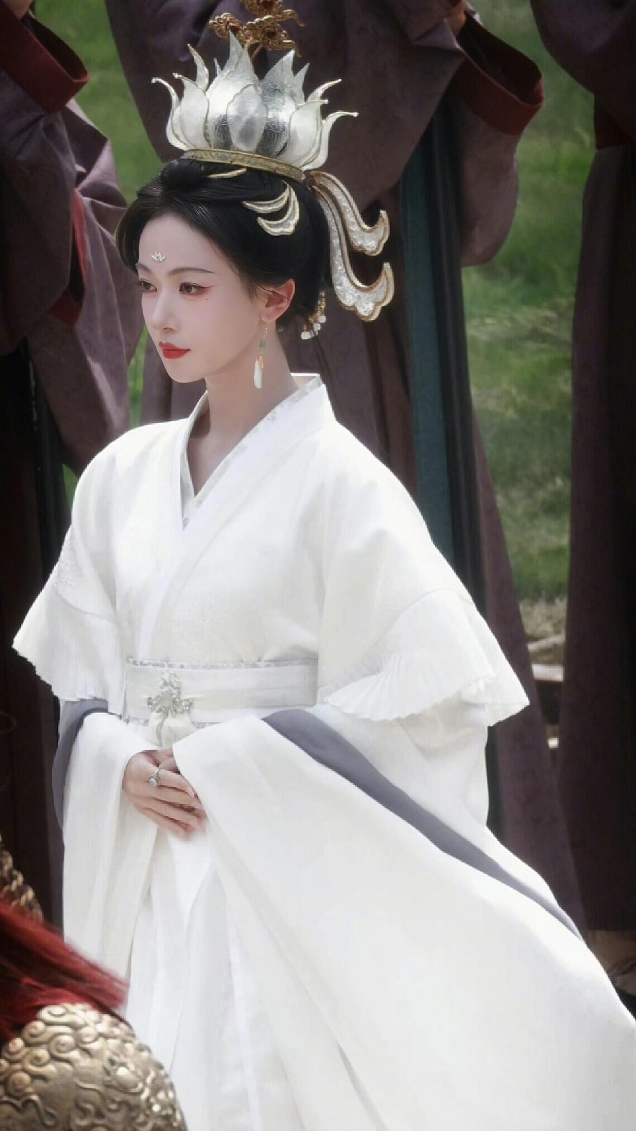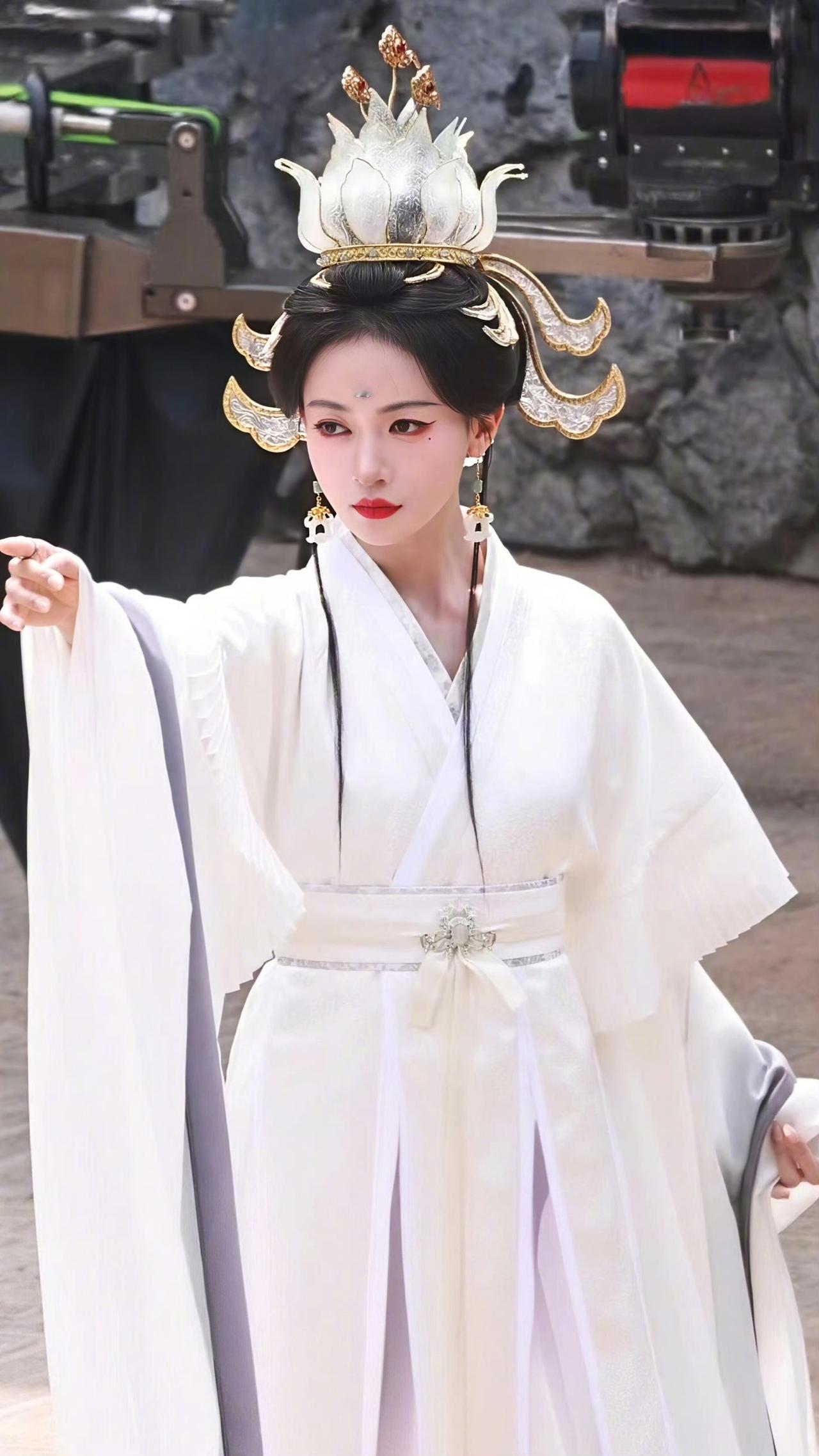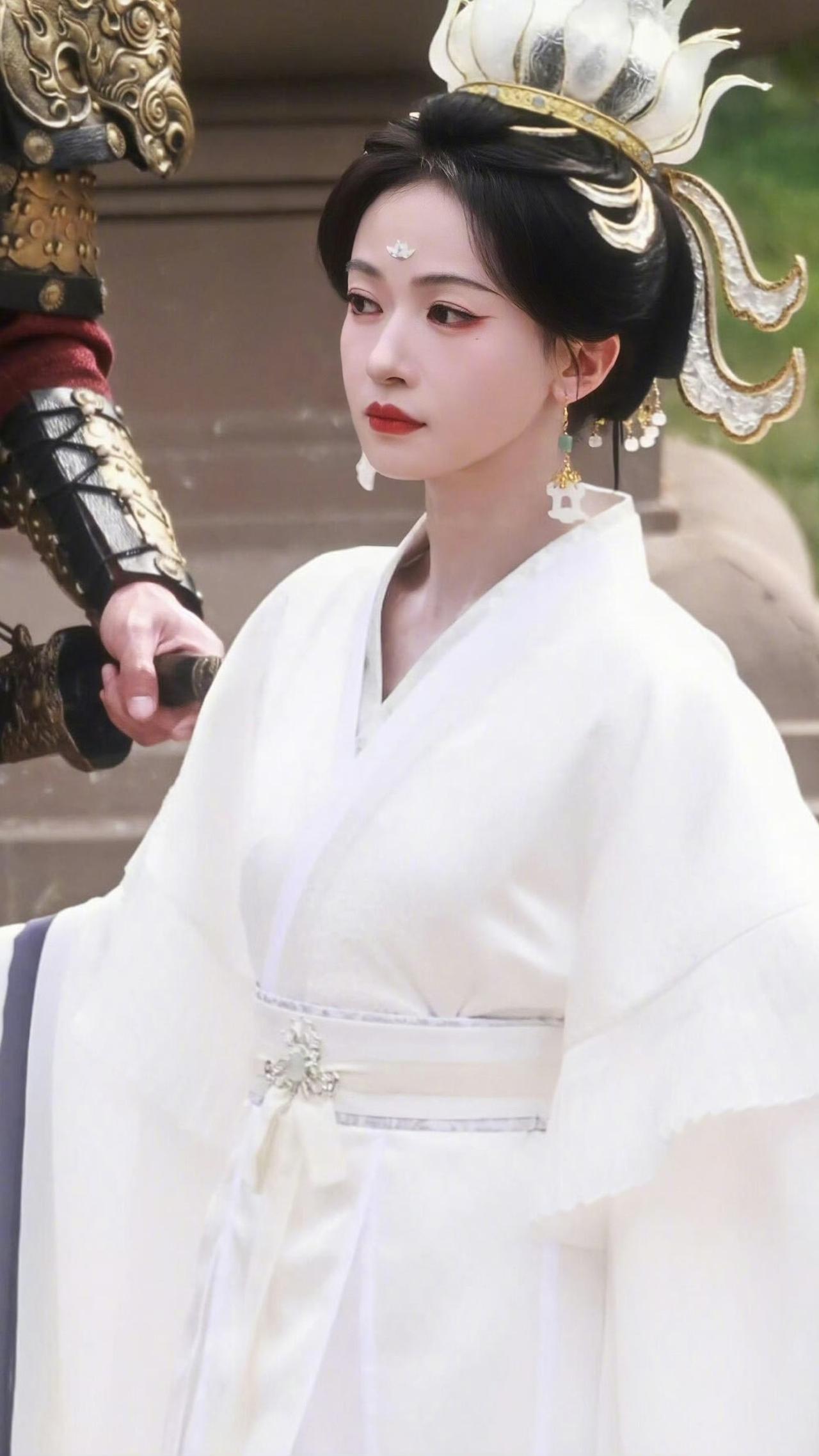 一身素白宽袖长袍,搭配莲纹冠饰,眉眼间褪去了以往的尖锐感,添了几分柔和的肉感,却反而让五官更舒展耐看。站在那里,背挺得笔直,既有上位者的清冷气场,又藏着故事里的张力,一眼就能让人相信她角色里的身份与过往。