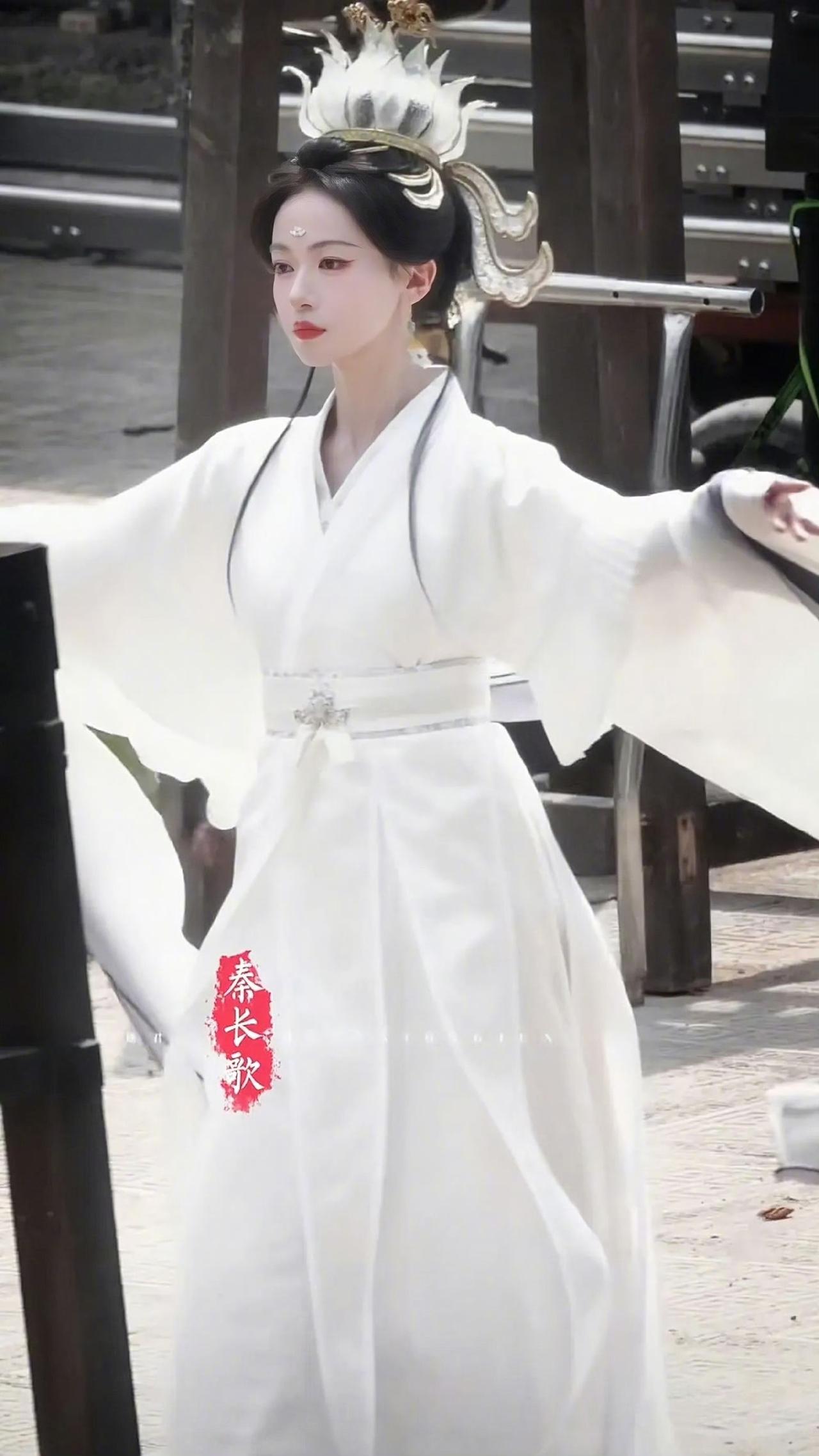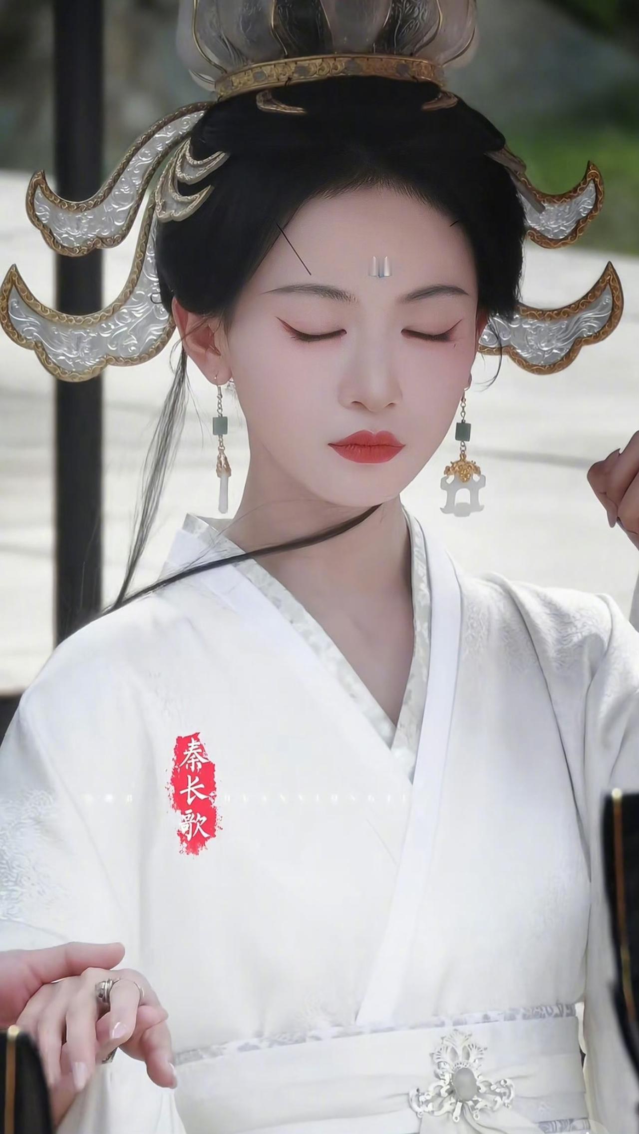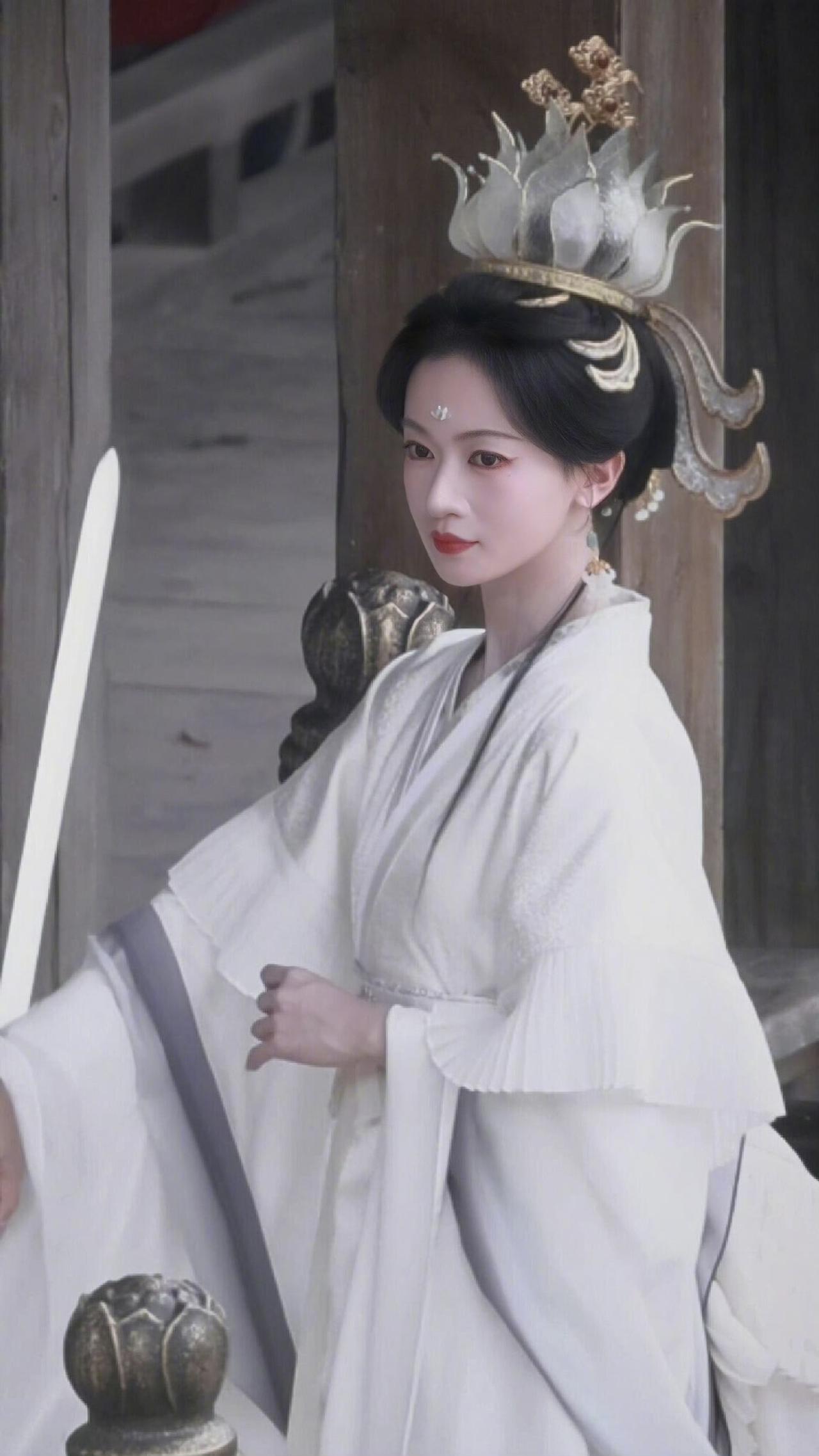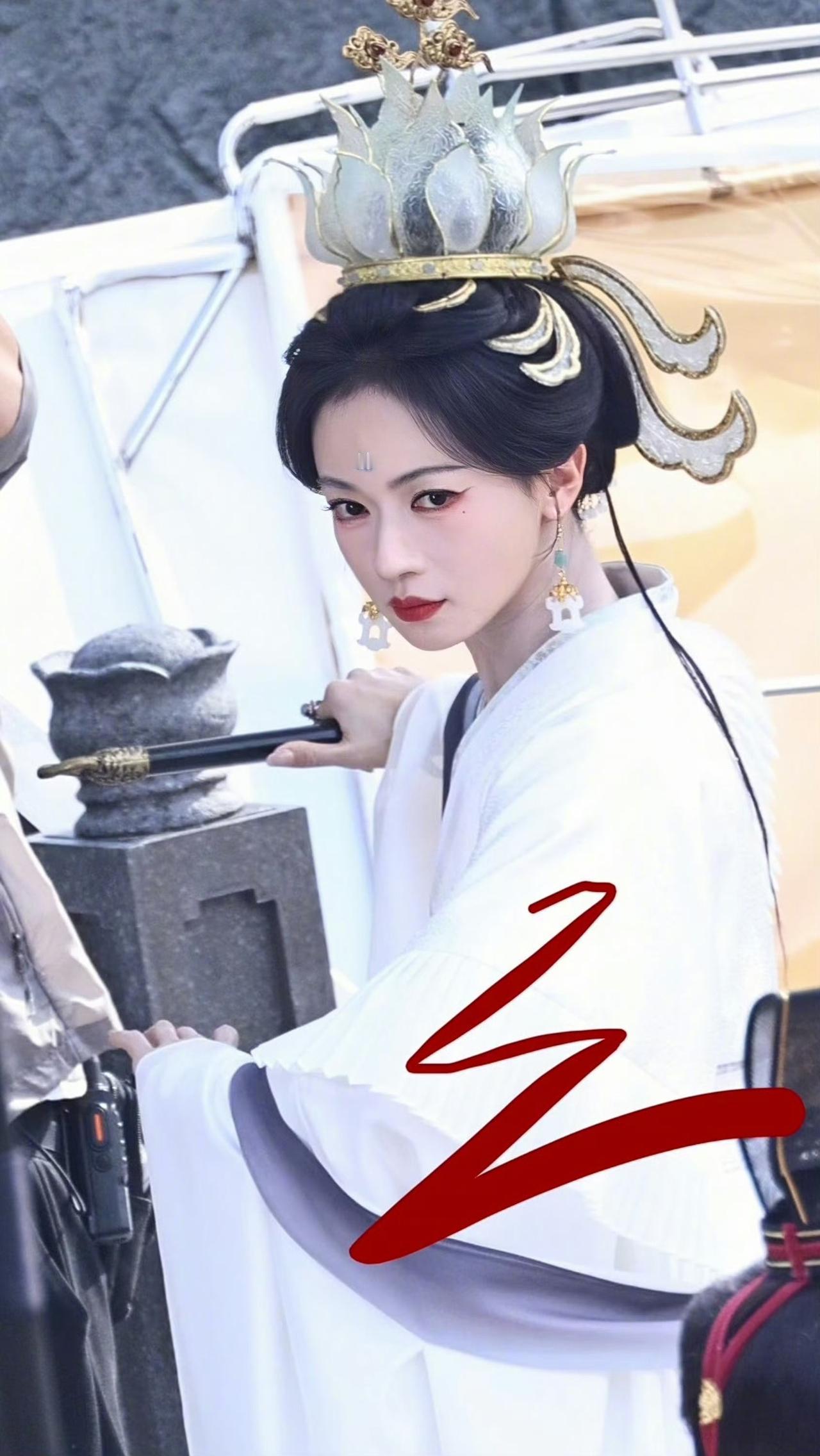 一身素白宽袖长袍,搭配莲纹冠饰,眉眼间褪去了以往的尖锐感,添了几分柔和的肉感,却反而让五官更舒展耐看。站在那里,背挺得笔直,既有上位者的清冷气场,又藏着故事里的张力,一眼就能让人相信她角色里的身份与过往。