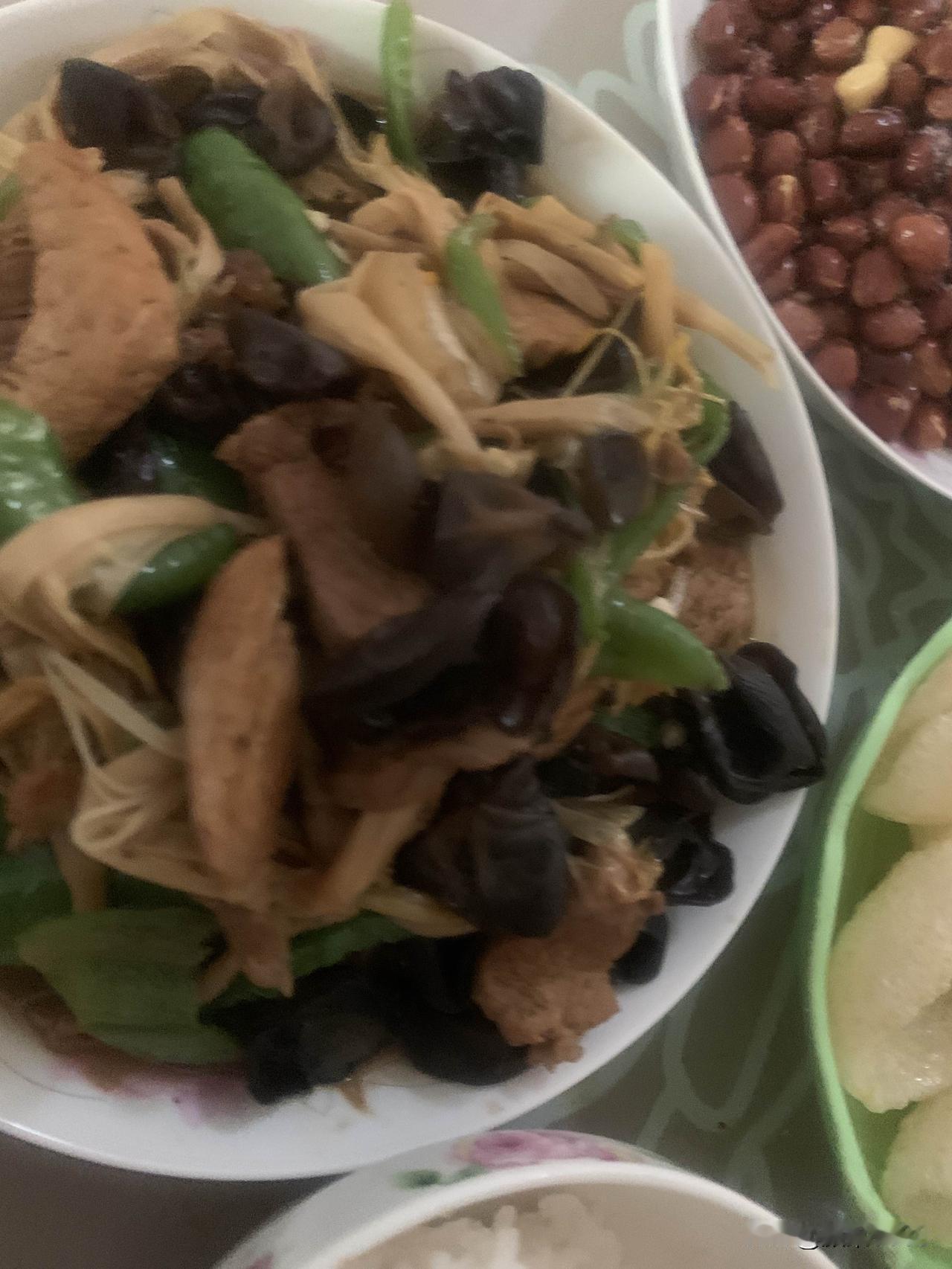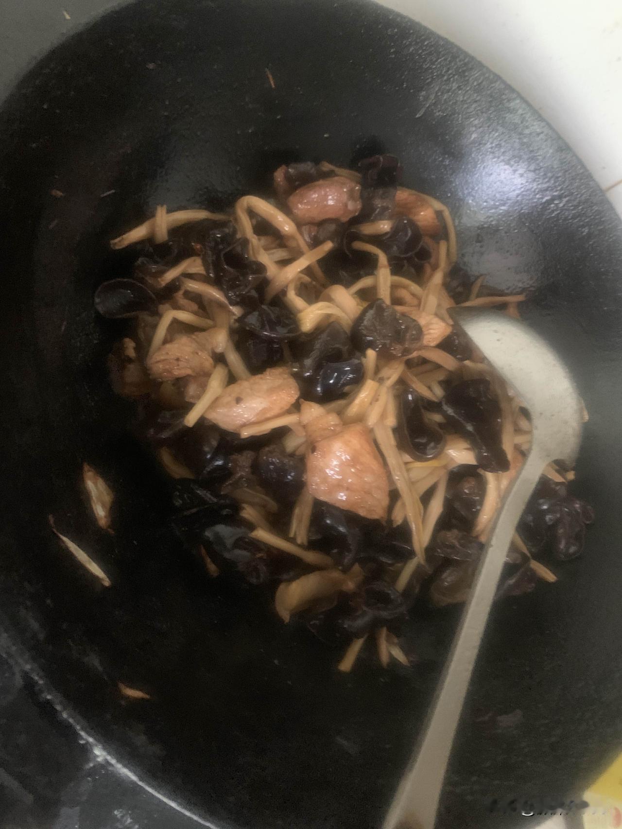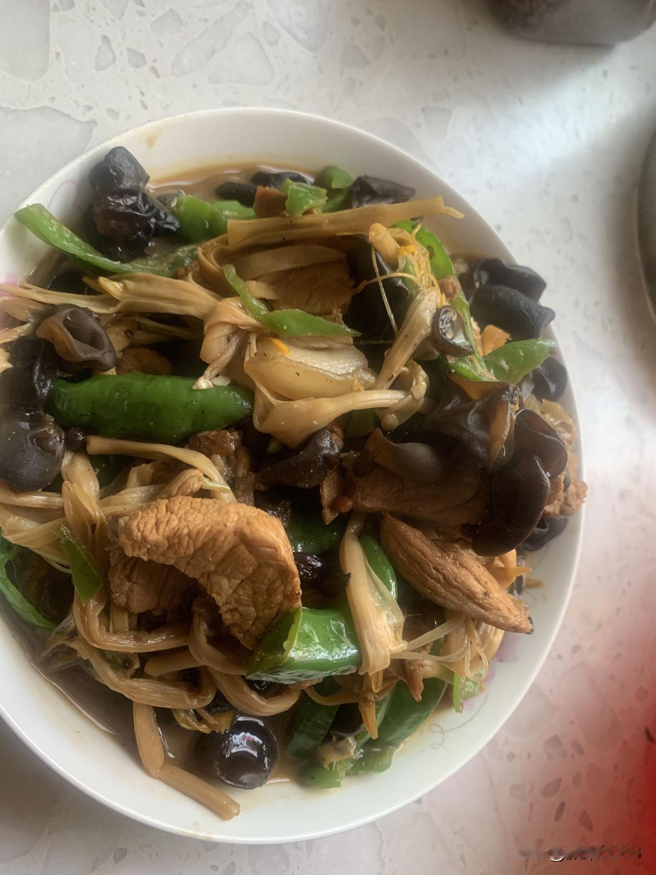 准备炒菜,热锅凉油放大肉,爆炒香味后放料酒、花椒、盐、十三香、酱油,然后翻炒片刻后放入木耳和黄花菜,青辣椒,葱姜蒜切末放入,翻炒片刻放入少许开水,盖锅盖。三分钟后出锅,盛盘,电饭锅米饭已好。色香味俱全的木耳黄花菜炒肉,米饭,一顿简单美味午餐做好了,用时13分钟左右。开造!