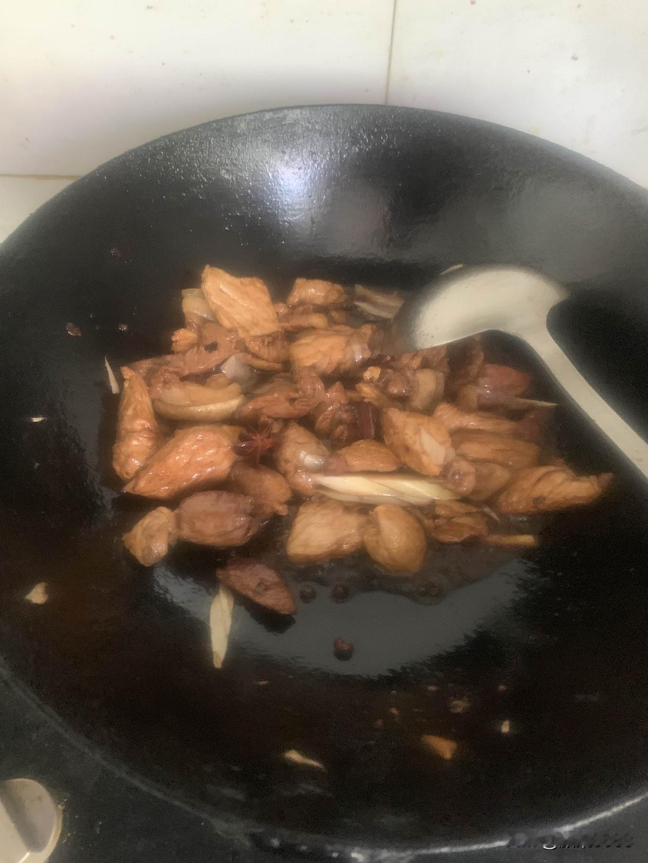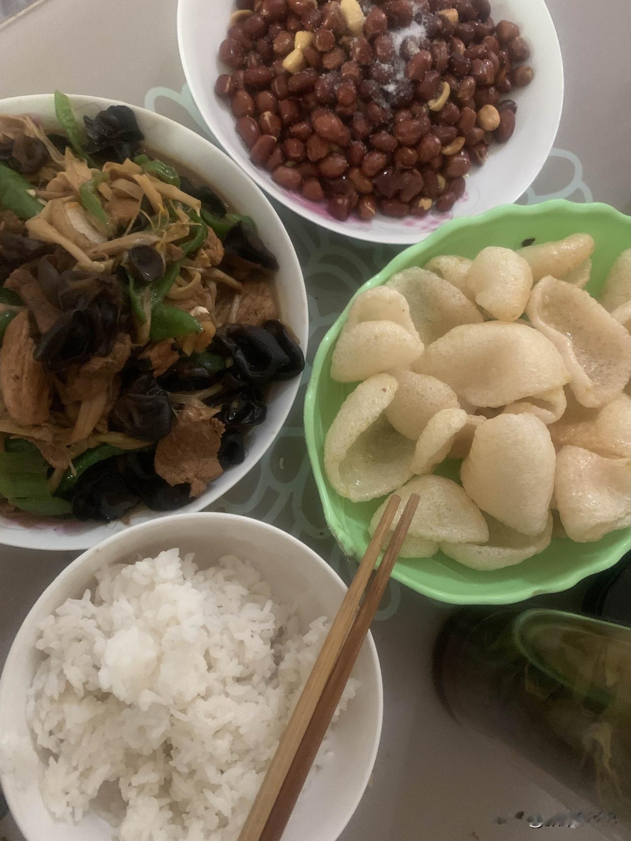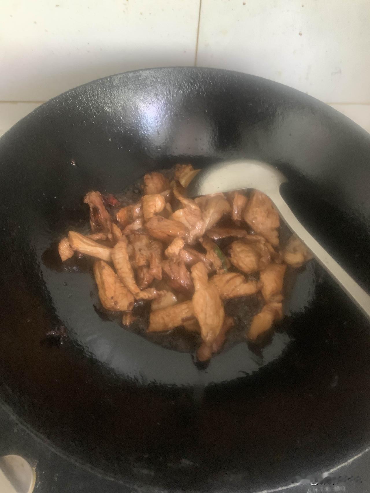 准备炒菜,热锅凉油放大肉,爆炒香味后放料酒、花椒、盐、十三香、酱油,然后翻炒片刻后放入木耳和黄花菜,青辣椒,葱姜蒜切末放入,翻炒片刻放入少许开水,盖锅盖。三分钟后出锅,盛盘,电饭锅米饭已好。色香味俱全的木耳黄花菜炒肉,米饭,一顿简单美味午餐做好了,用时13分钟左右。开造!