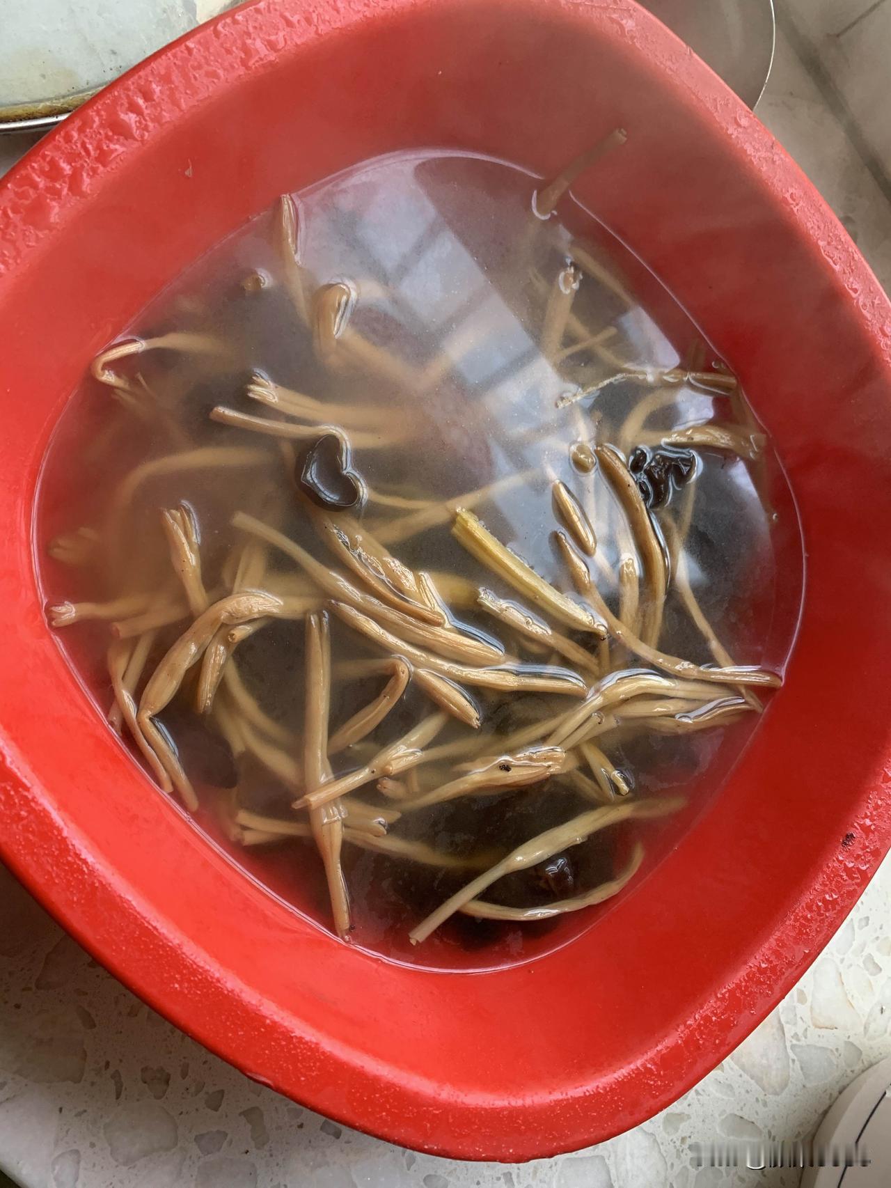 自己买了10元大肉,干木耳、干黄花菜家里有,切肉、木耳和黄花菜开水泡几分钟,然后凉水洗干净,清洗干净后,配料准备好。